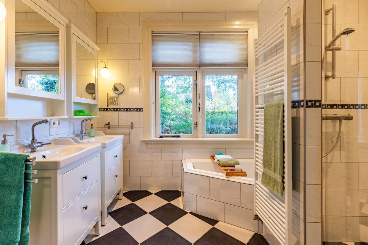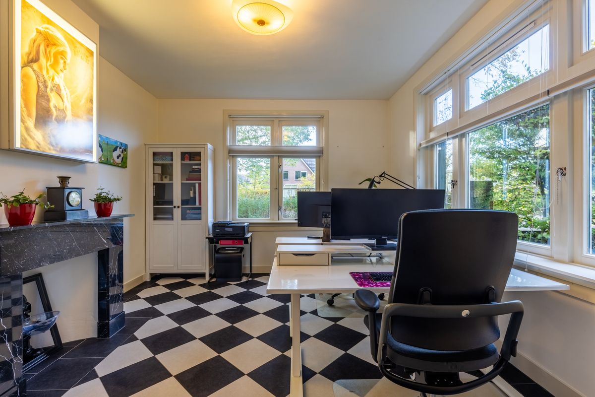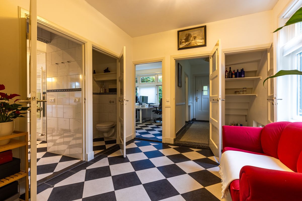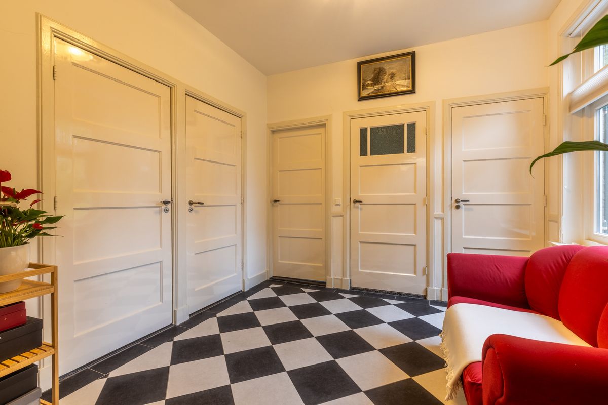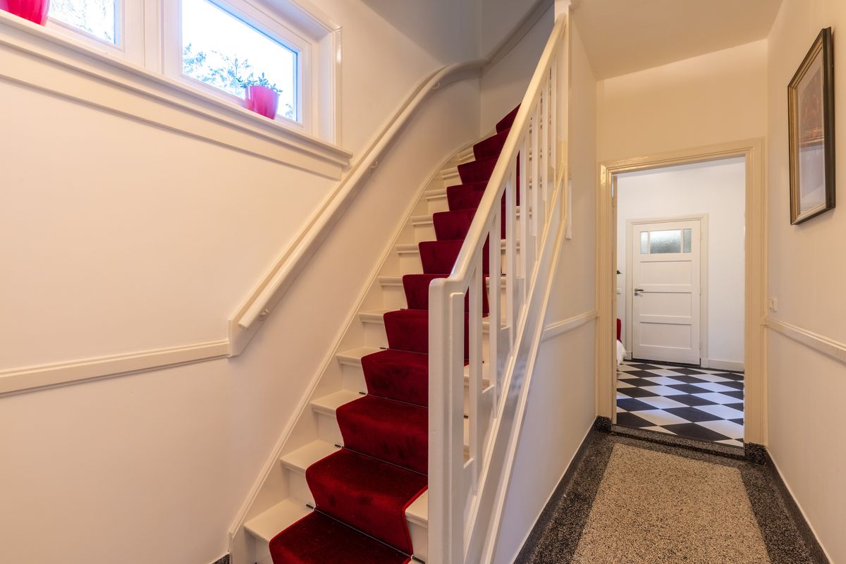 The stylish entrance with original terrazzo floor and a beautiful wooden staircase with red carpet immediately sets the tone for the rest of the house. From the hallway, you have access to several rooms: a charming reception room, an office or bedroom with classic fireplace, the cellar, a toilet, a bathroom with double washbasin, bathtub and separate shower, and a separate laundry room.