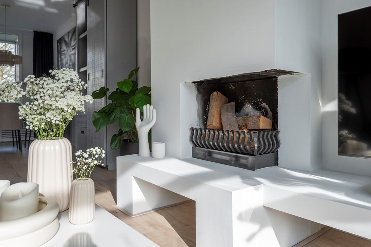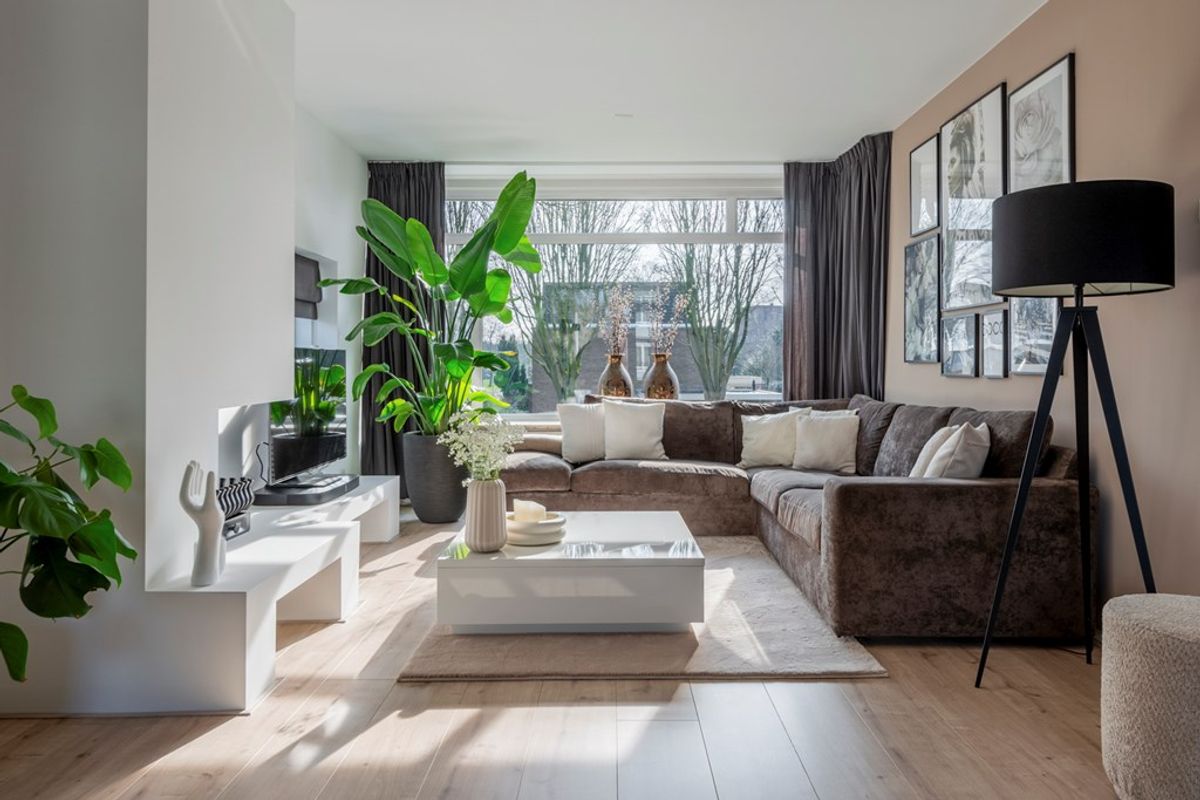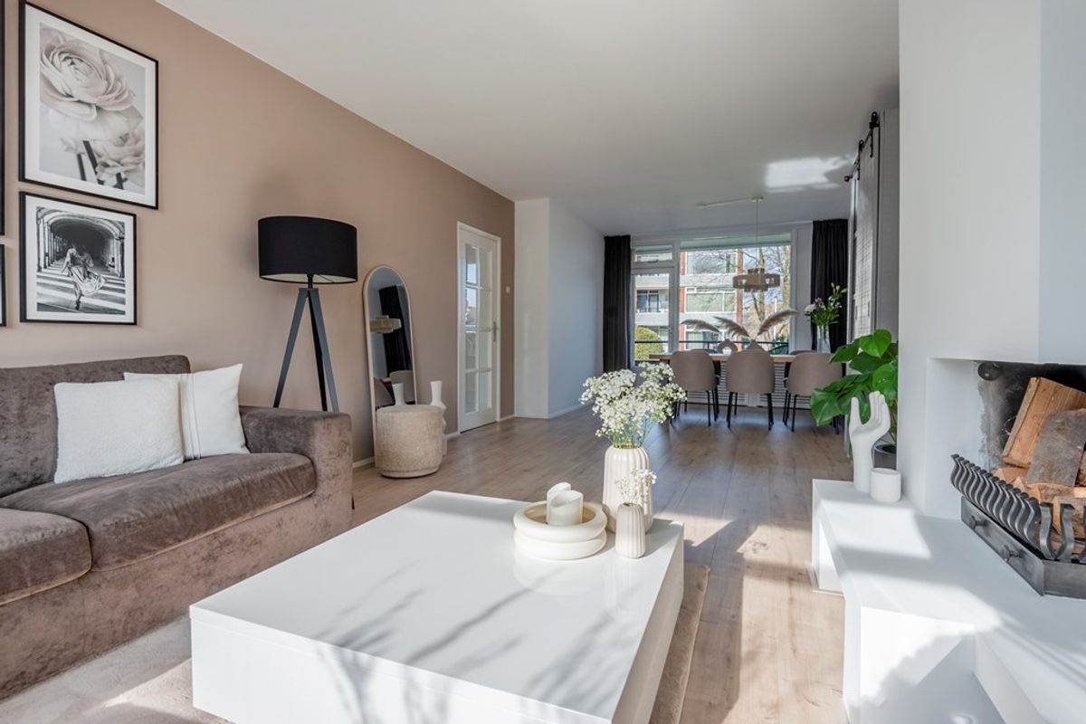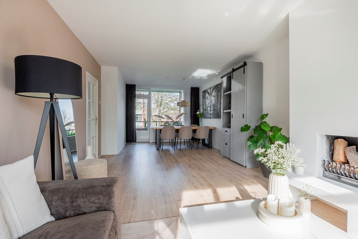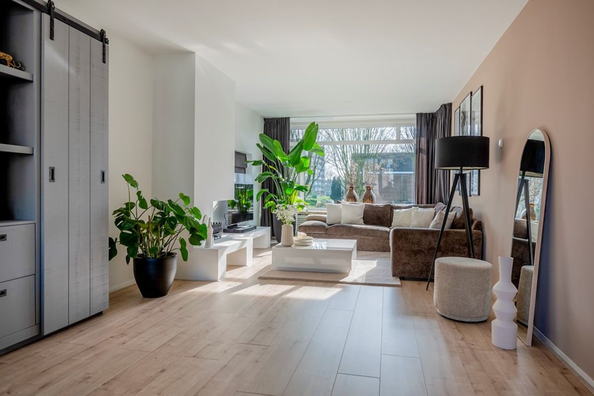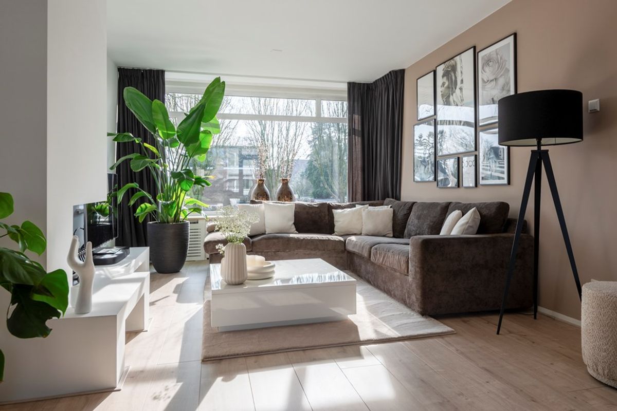 Bij binnenkomst in de woonkamer valt direct de lichtinval en de moderne afwerking op. Alle wanden en plafonds zijn voorzien van strak stucwerk en door het gehele appartement ligt dezelfde laminaatvloer. Leuke details zijn dat de woonkamer een open haard heeft en een elektrische zonwering met afstandsbediening.