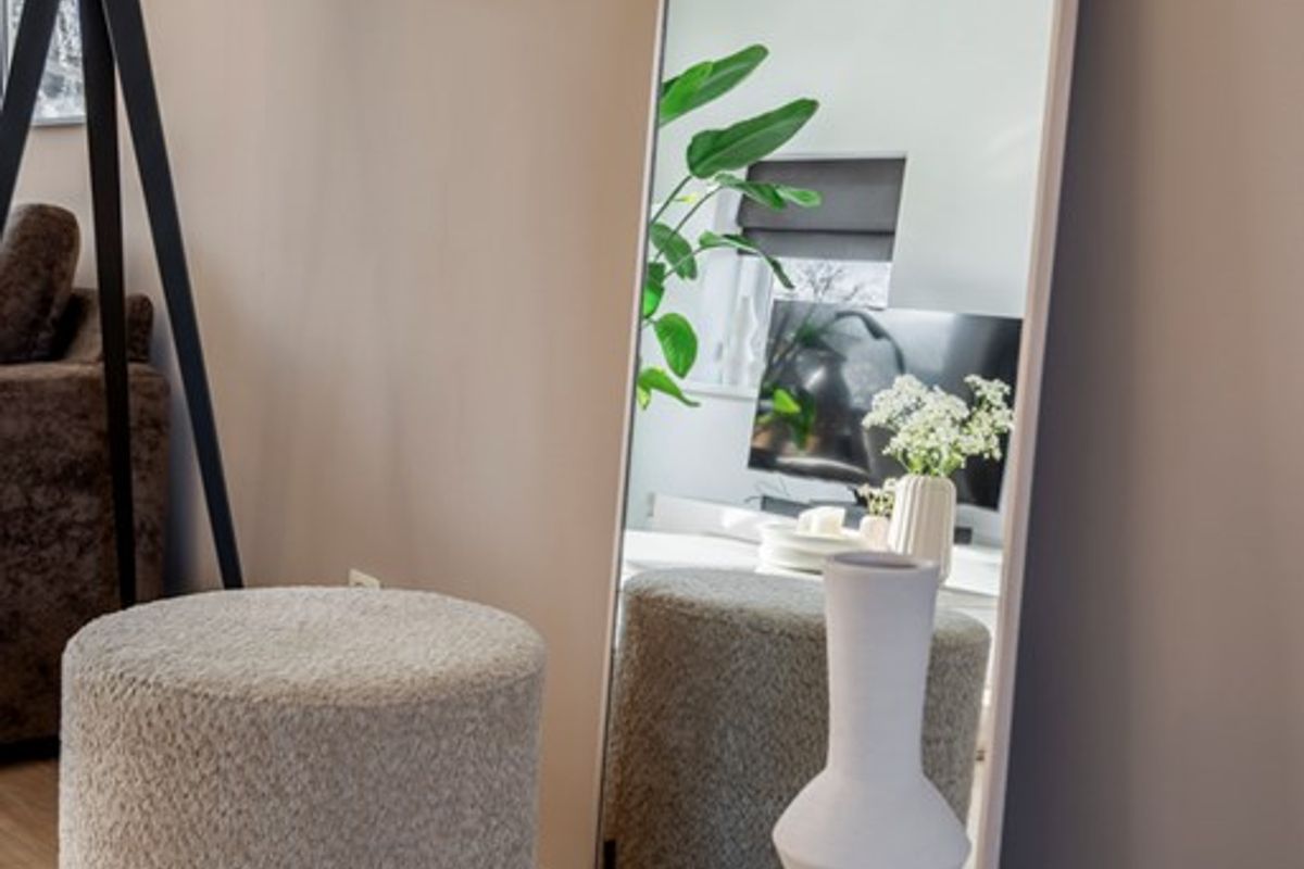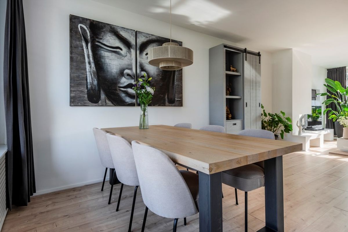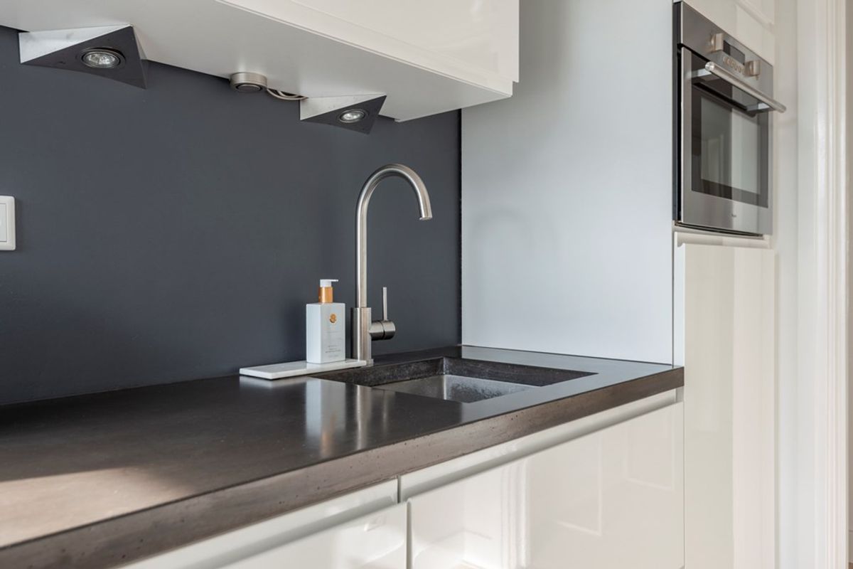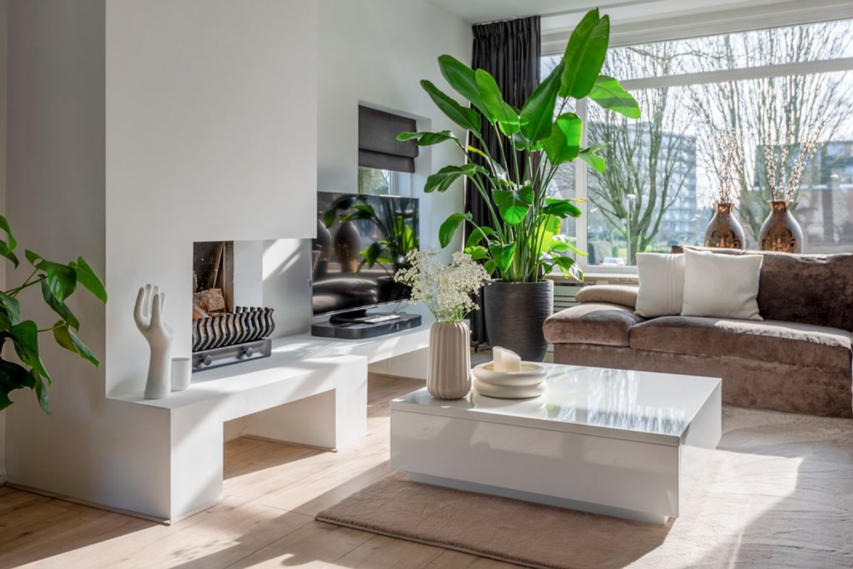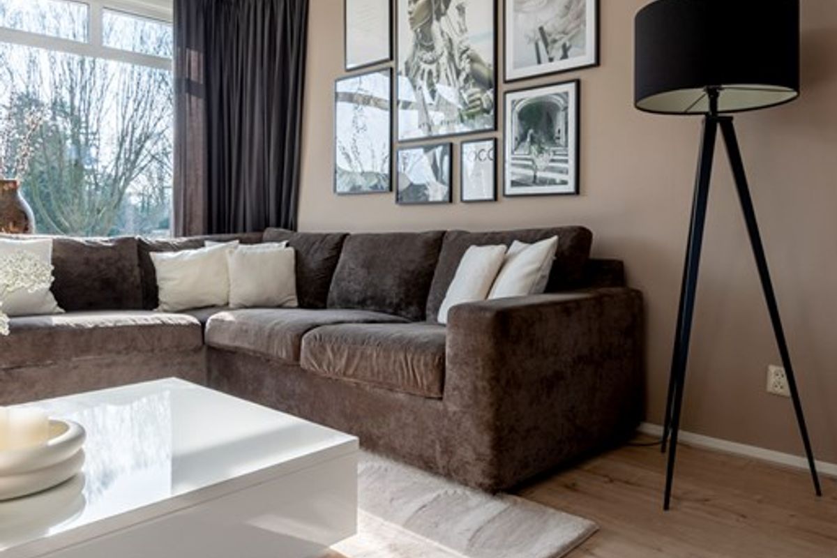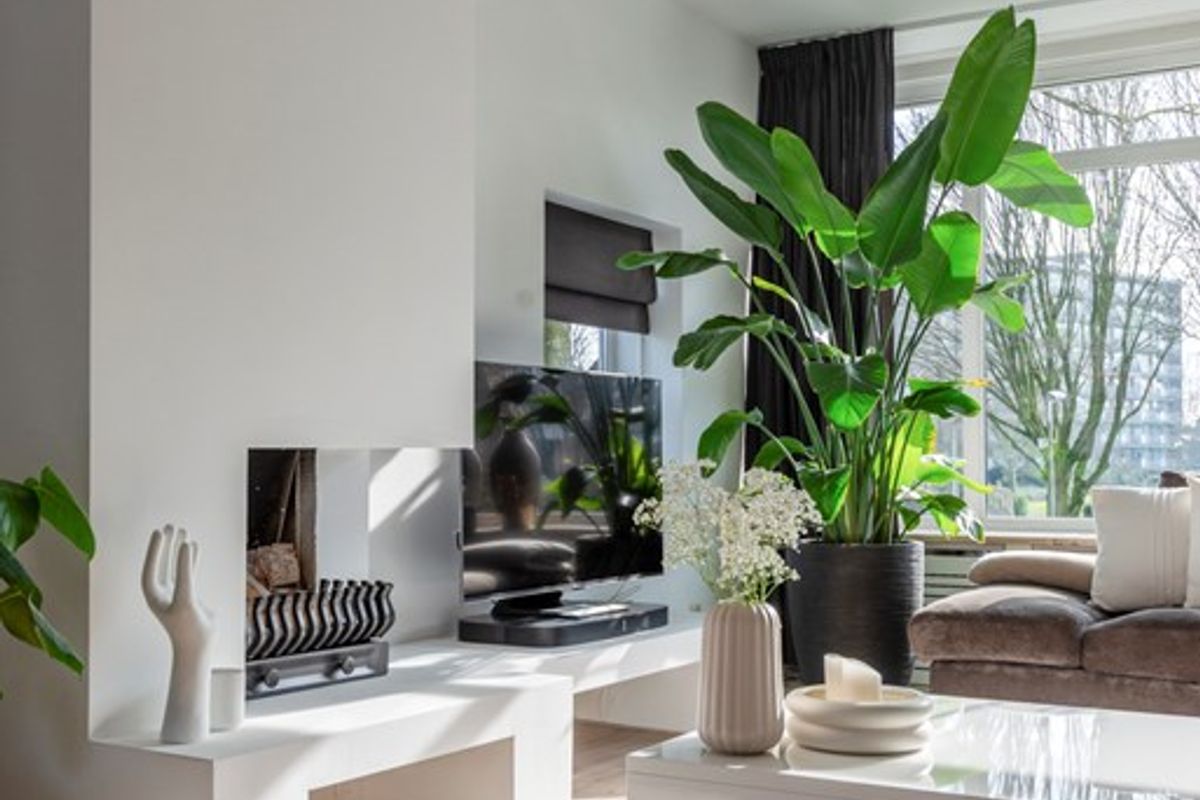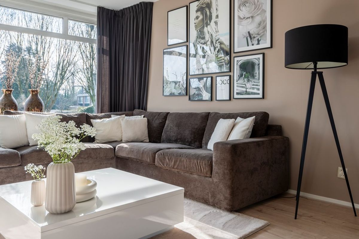 Bij binnenkomst in de woonkamer valt direct de lichtinval en de moderne afwerking op. Alle wanden en plafonds zijn voorzien van strak stucwerk en door het gehele appartement ligt dezelfde laminaatvloer. Leuke details zijn dat de woonkamer een open haard heeft en een elektrische zonwering met afstandsbediening.