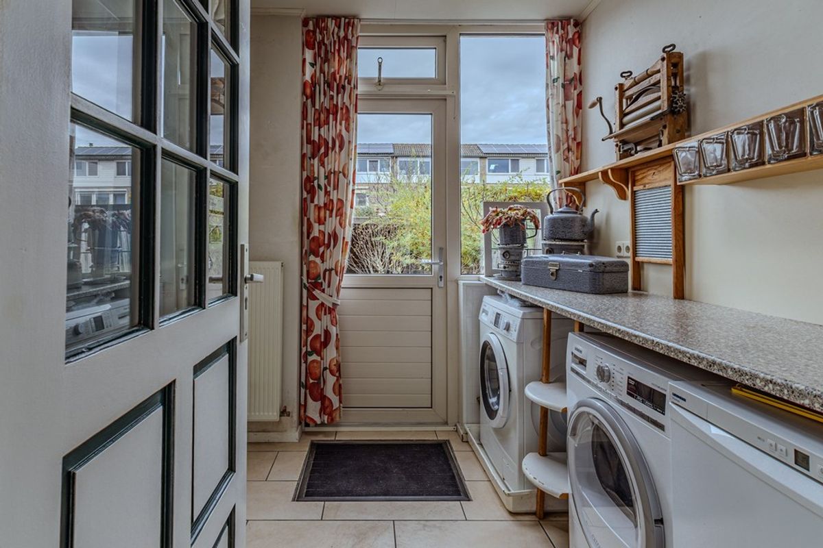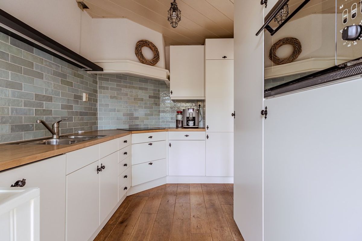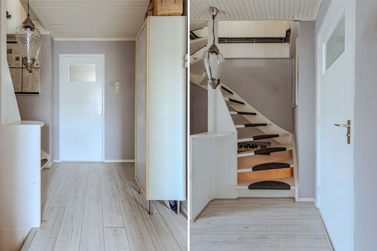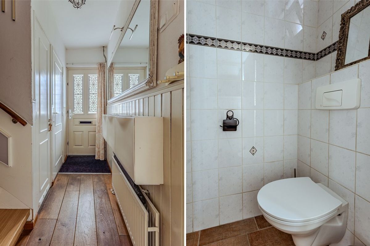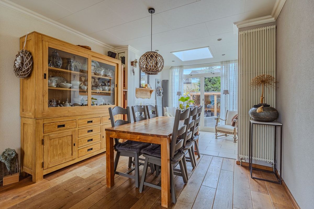 Entree in de hal met garderoberuimte, meterkast, trapkast, de volledig betegelde toiletruimte met zwevend toilet en de trapopgang. De woning is in 2004 aan de achterzijde uitgebouwd en biedt openslaande deuren naar de tuin en een lichtkoepel wat zorgt voor een fijne lichtinval. De natuurlijke scheiding tussen het zit- en het eetgedeelte wordt gevormd door de doorgang naar de keuken. Deze keuken in L-opstelling is door de jaren heen voorzien van nieuwe apparatuur en de frontjes, muurtegeltjes en het aanrechtblad zijn recent vernieuwd. Van hieruit toegang tot de achtergelegen bijkeuken waar zich de witgoedaansluitingen, vaste kastruimte en een garderoberuimte bevinden. Tevens vanuit de bijkeuken toegang tot de achtertuin.
