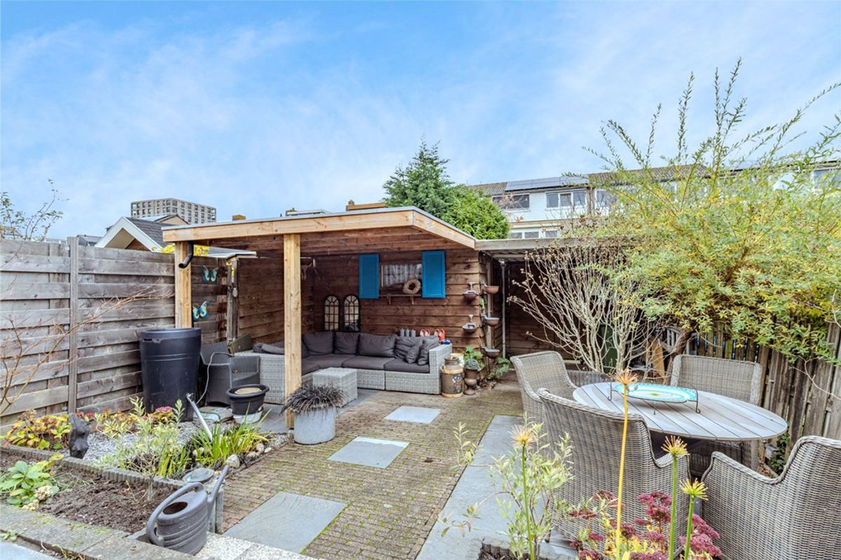 De achtertuin met overkapping en berging biedt eindeloze mogelijkheden: een gezellige zithoek voor zomerse avonden, een plek om te tuinieren of de vrijheid om de tuin helemaal naar eigen wens in te richten. Met 9 zonnepanelen wekt de woning bovendien een groot deel van de energie zelf op, wat merkbaar scheelt in de maandelijkse kosten.