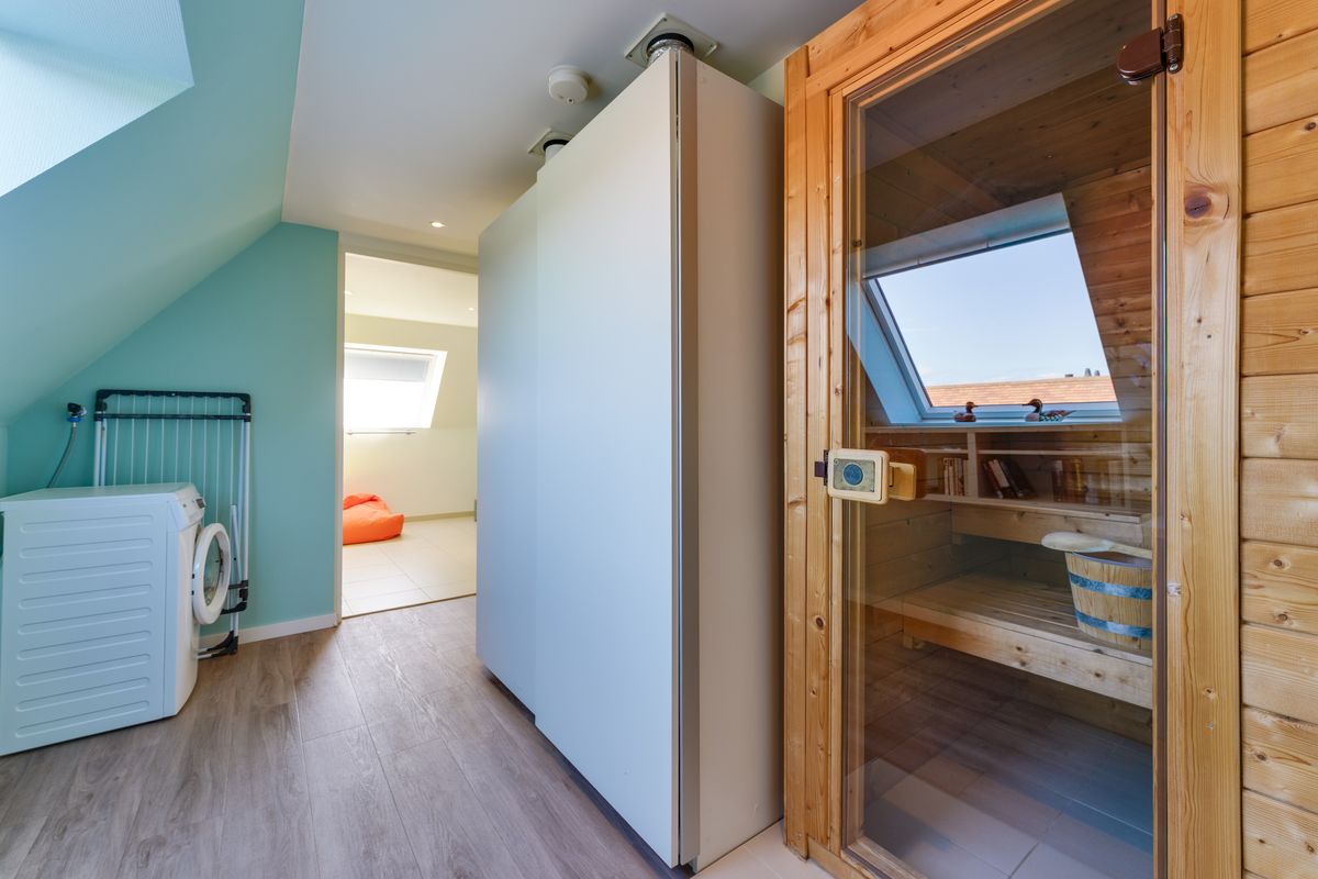We gaan nog een verdieping omhoog en komen op de verrassend ruime zolder. Het grote dakraam zorgt voor veel licht en een open gevoel. Op deze verdieping ontdek je de Finse sauna – dé plek om helemaal tot rust te komen na een stranddag of lange wandeling. Daarnaast bevindt zich hier een tweede badkamer met douche, toilet en wastafelmeubel, praktisch én luxe.