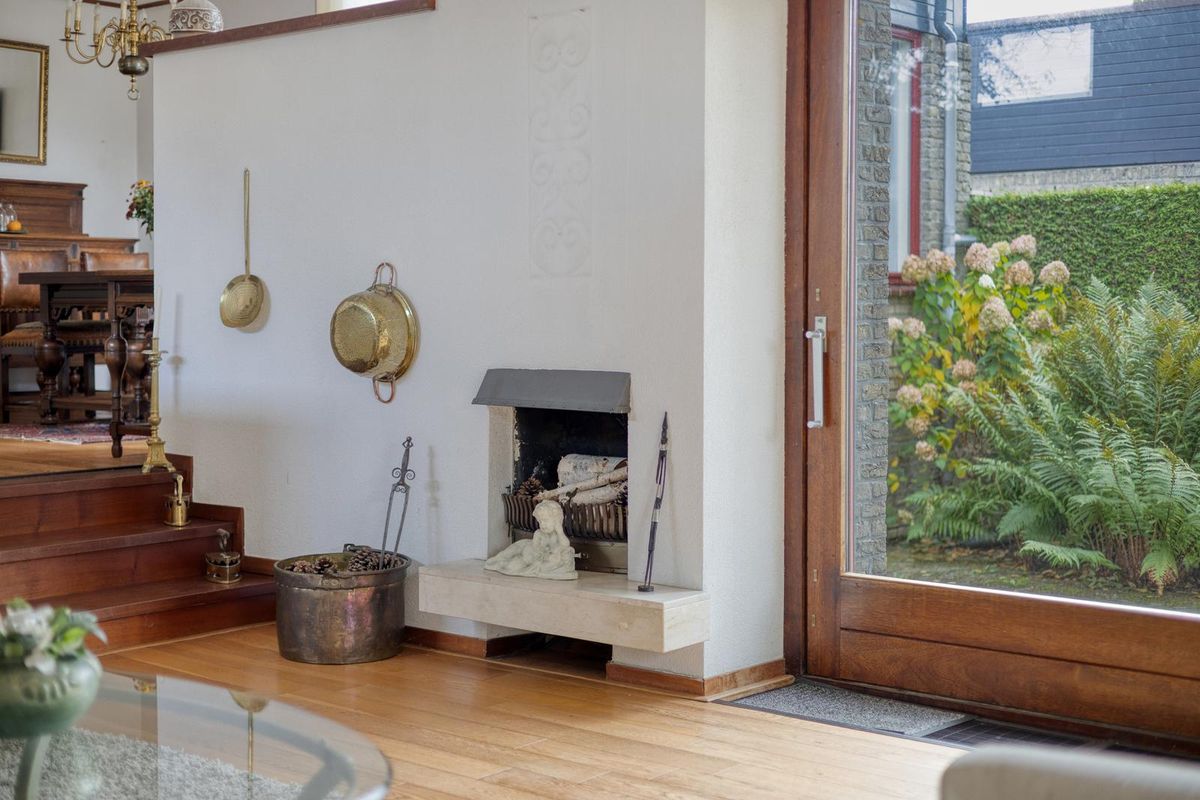 * De royale en veelzijdige tuin beschikt over meerdere terrassen, een sfeervolle buitenhaard voor lange zomeravonden of warme wintermomenten, elektrische buitenzonwering, houten berging en een eigen achterom.