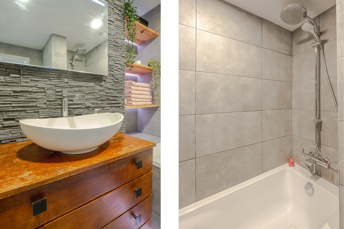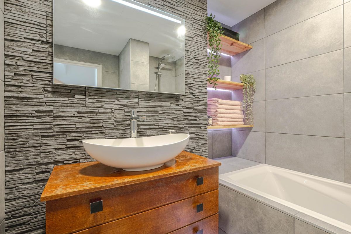 * Moderne badkamer, geheel voorzien van luxe betegeling, verlaagd plafond met inbouwspots, ligbad met regendouche, wastafelmeubel en wandtoilet.