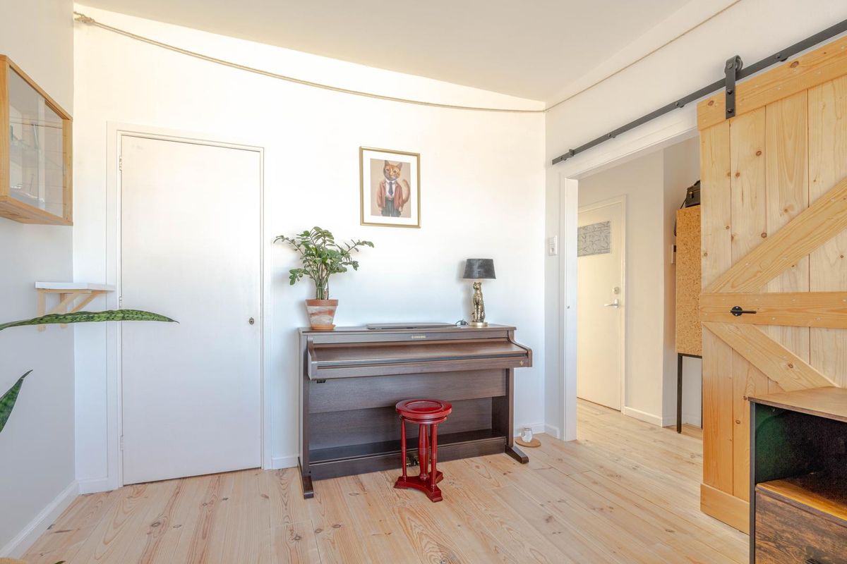 * Slaapkamer II aan de galerijzijde, in gebruik als werkkamer, voorzien van een loftdeur, houten plankenvloer en een vaste kast met de opstelling van de boiler.