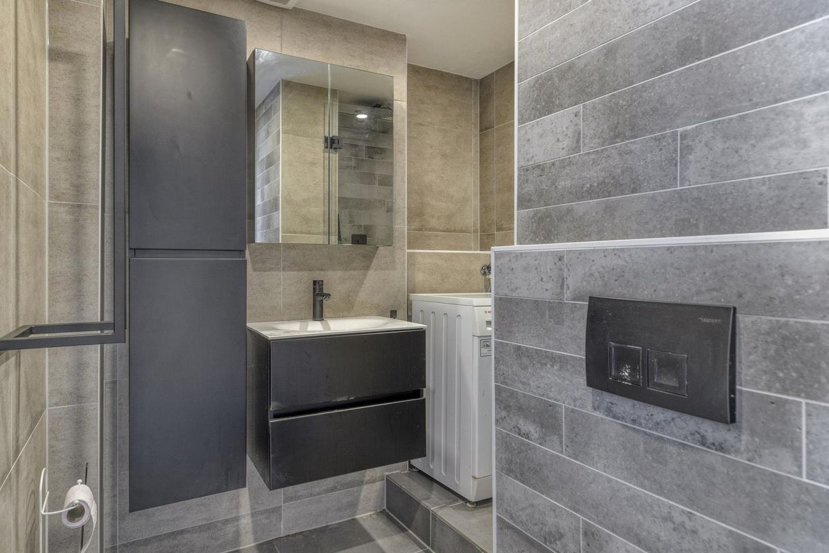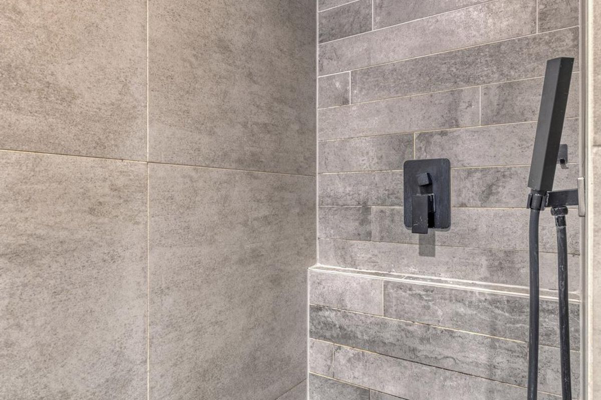 -Badkamer: De badkamer is modern en sfeervol ingericht met een inloopdouche, hangtoilet en een strak wastafelmeubel met spiegelkast. De ruimte is compleet betegeld in grijstinten en afgewerkt met luxe matzwarte accenten. Wasmachine is netjes weggewerkt in een aparte nis, wat zorgt voor een opgeruimde uitstraling.