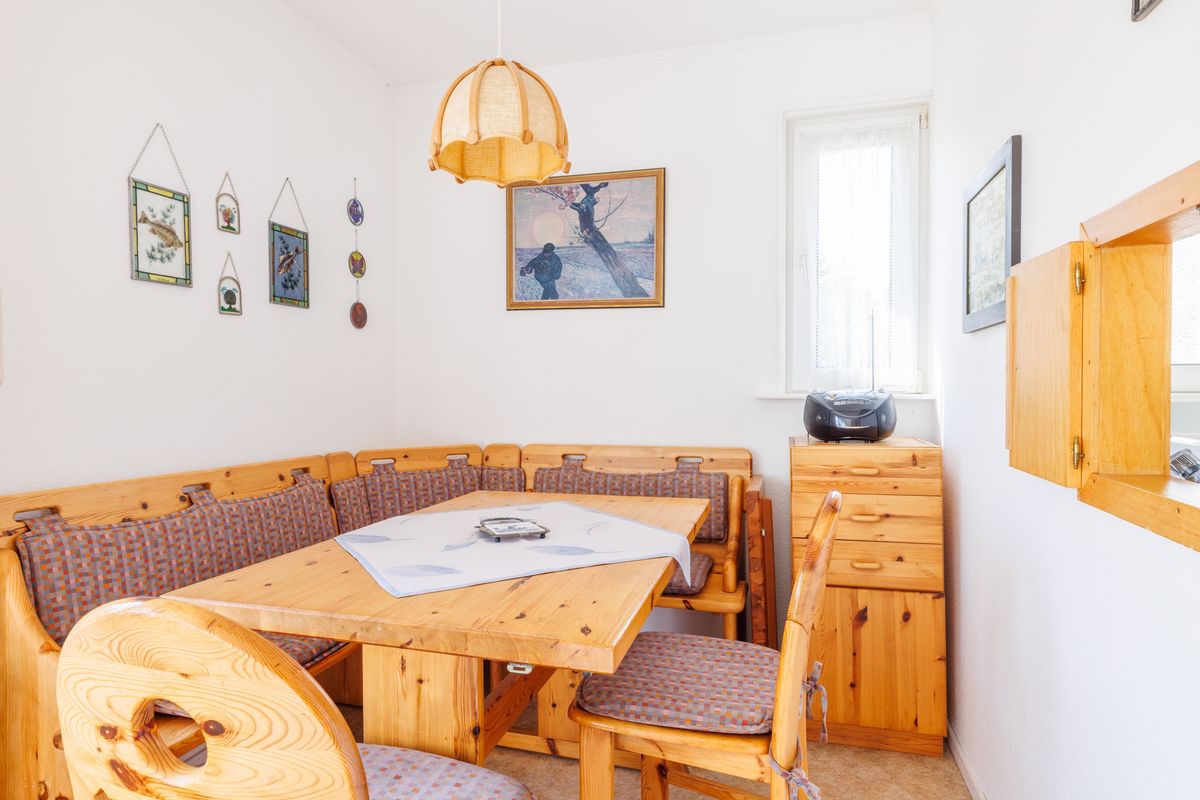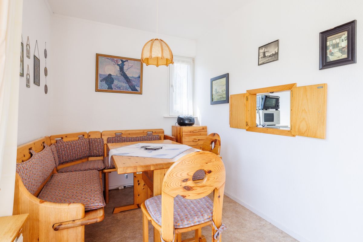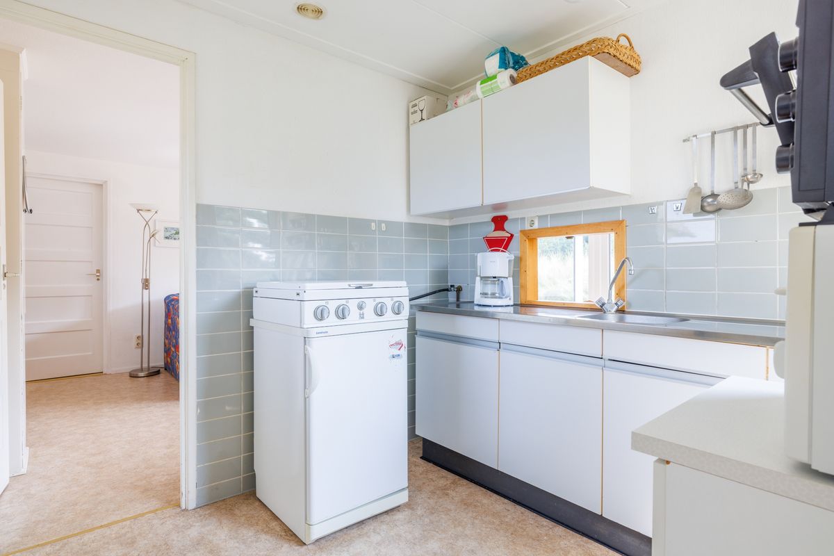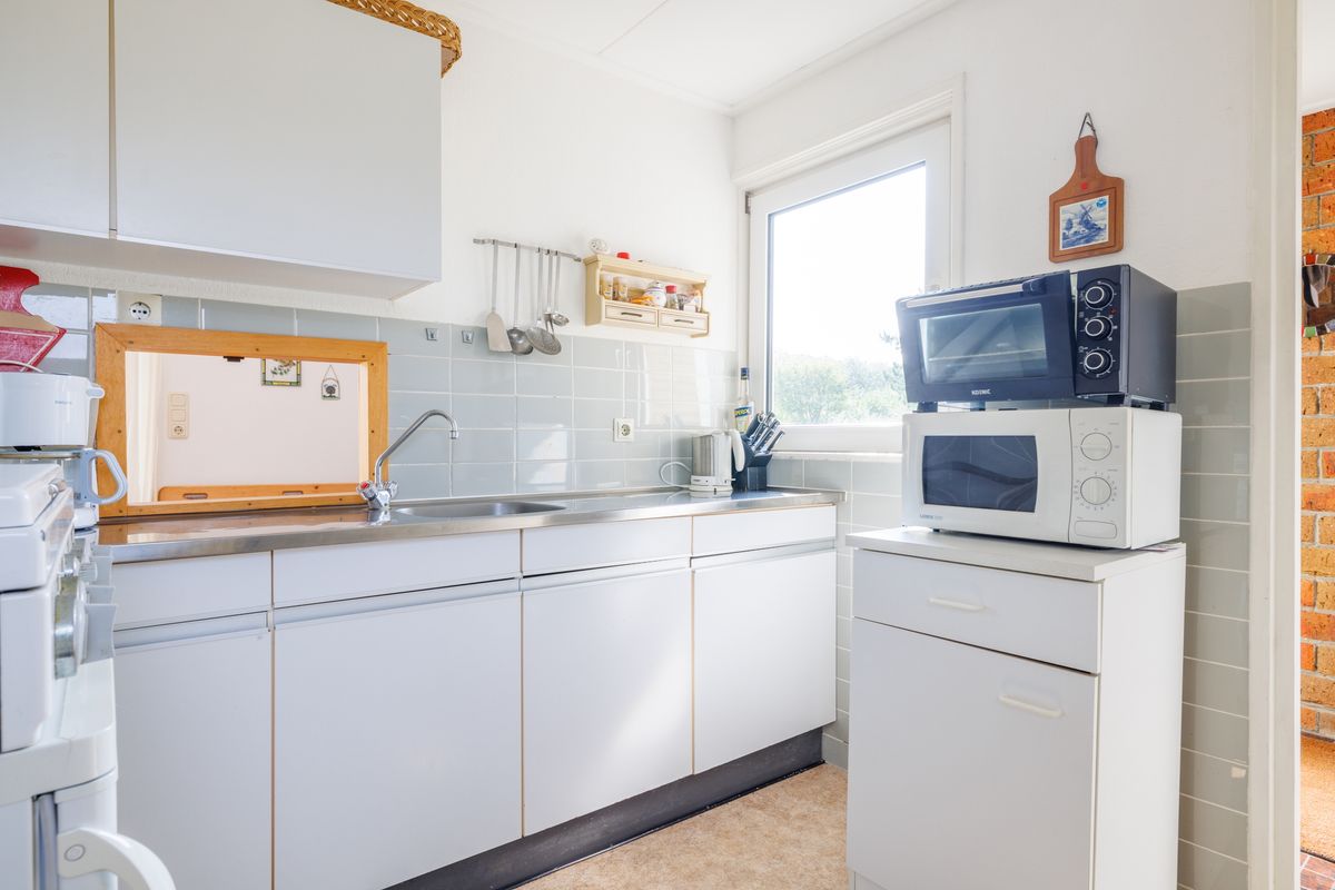- Eenvoudige keuken met doorgeefluikje naar de woonkamer.
