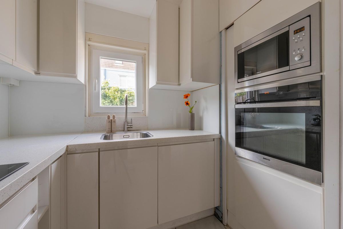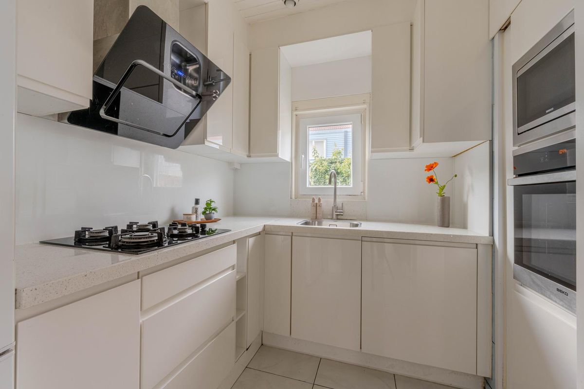 * Keukenruimte voorzien van hoek-inbouwkeuken met een granieten werkblad en inbouwapparatuur: gaskookplaat, combimagnetron, oven, schouw afzuigkap, vaatwasmachine en koel-vriescombinatie.