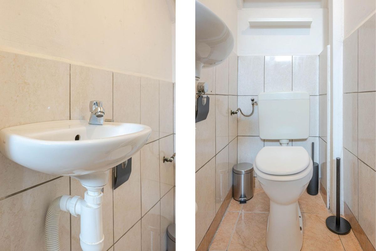 * Toiletruimte voorzien van duoblok-toiletopstelling, fonteintje en lichte betegeling.