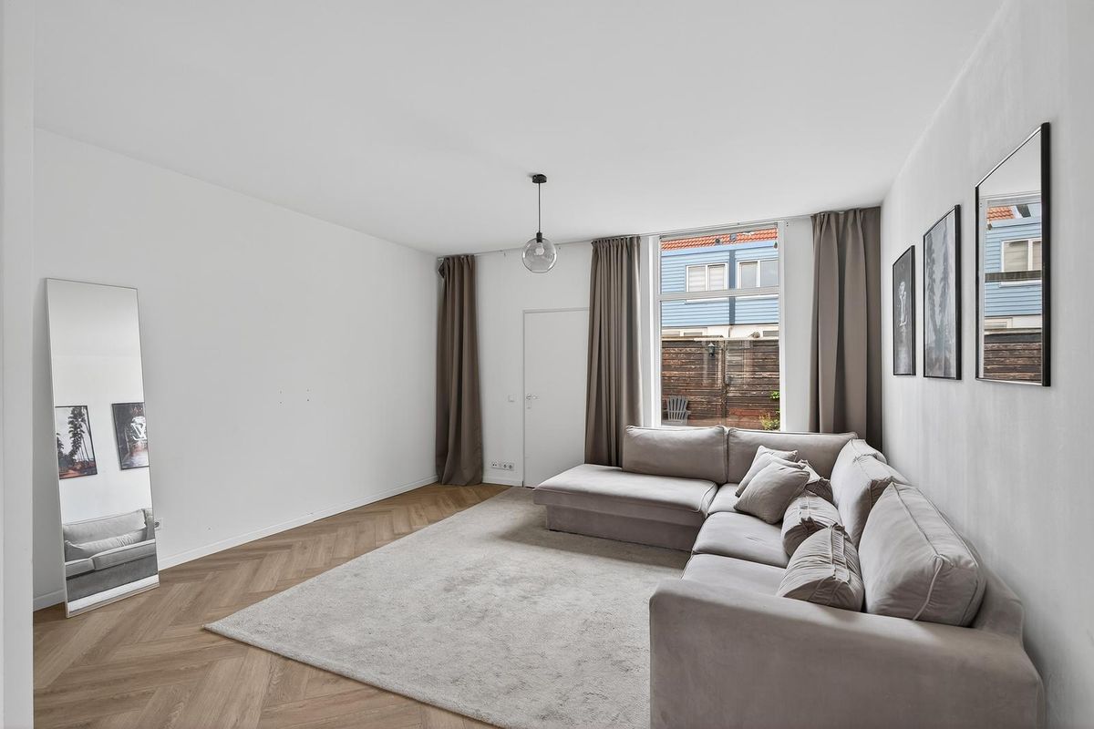 De lichte woonkamer heeft een eigentijdse uitstraling dankzij de moderne visgraat pvc-vloer met vloerverwarming en biedt een ruim zitgedeelte aan de achterzijde met een toegangsdeur naar de bijkeuken. De open trap naar de eerste verdieping geeft de ruimte extra karakter en heeft een handige trapkast eronder.