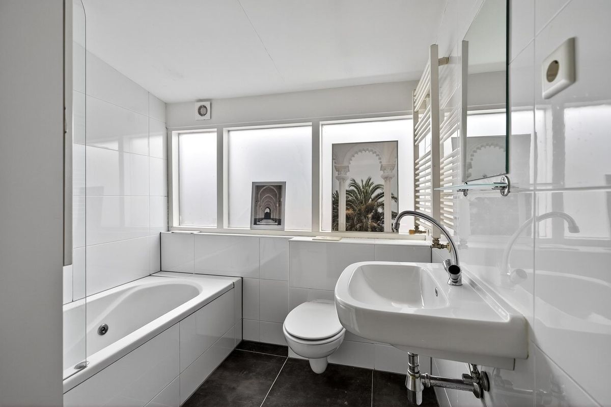 De tussengelegen badkamer is volledig betegeld in tijdloze witte wandtegels met antraciet vloertegels en voorzien van een ligbad met douchegelegenheid, een tweede wandcloset, een wastafel met spiegel en planchet én een radiator voor extra comfort. Door de aanwezige ramen is er natuurlijk licht in deze ruimte.