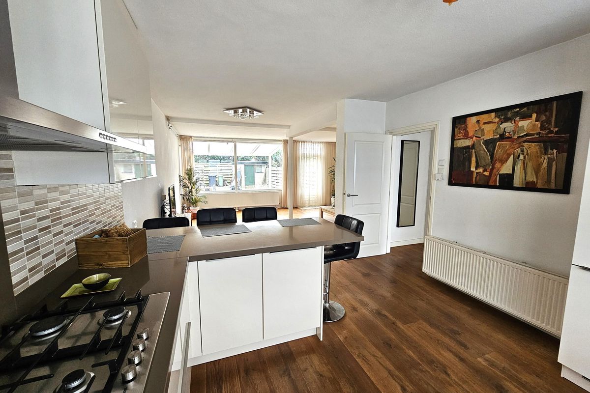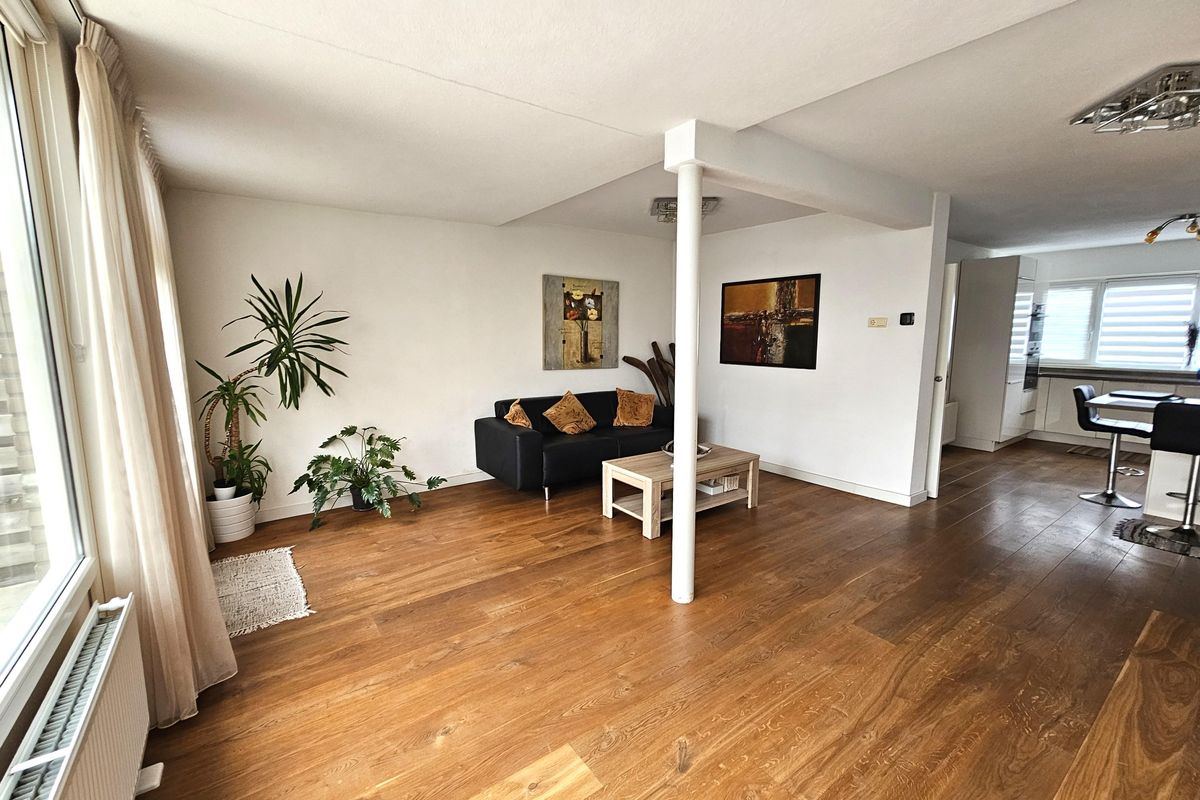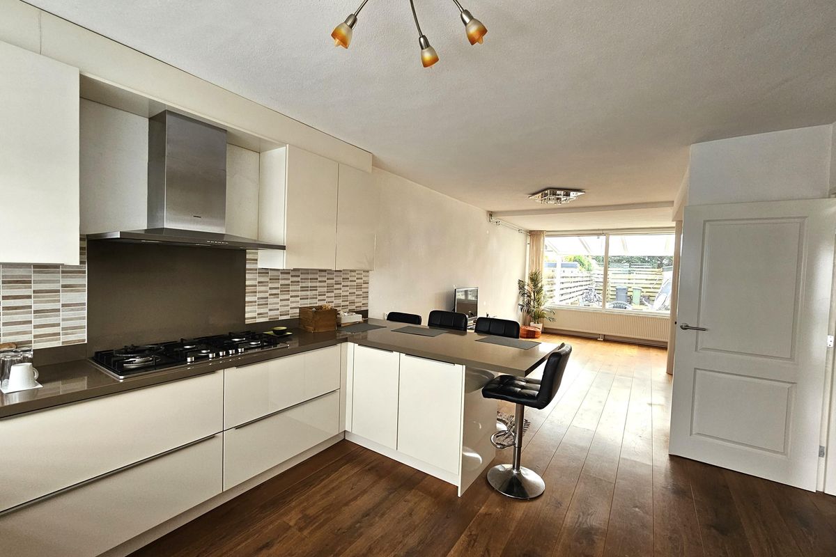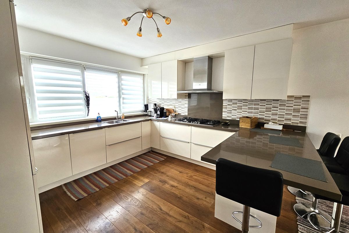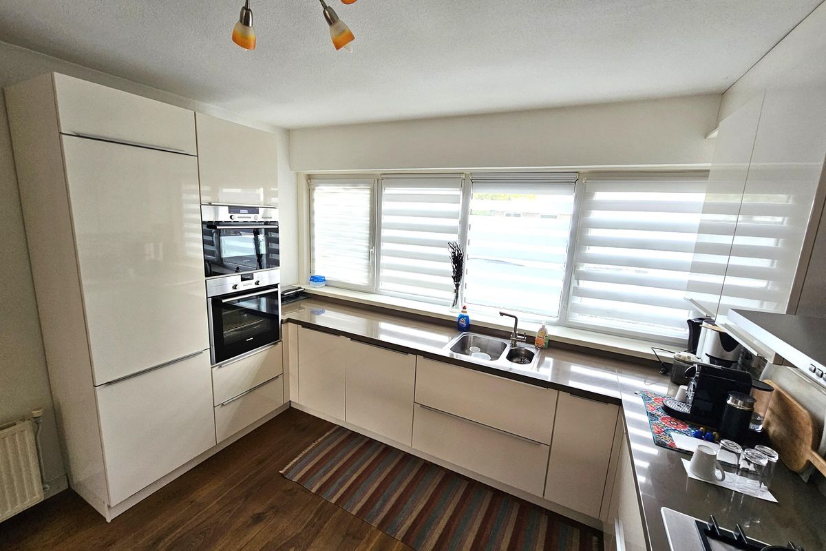 Ruime lichte woonkamer met open keuken voorzien van diverse inbouwapparatuur o.a. koel/vries combi, oven en magnetron, vaatwasser, 5-pits gasstel, afzuigkap.