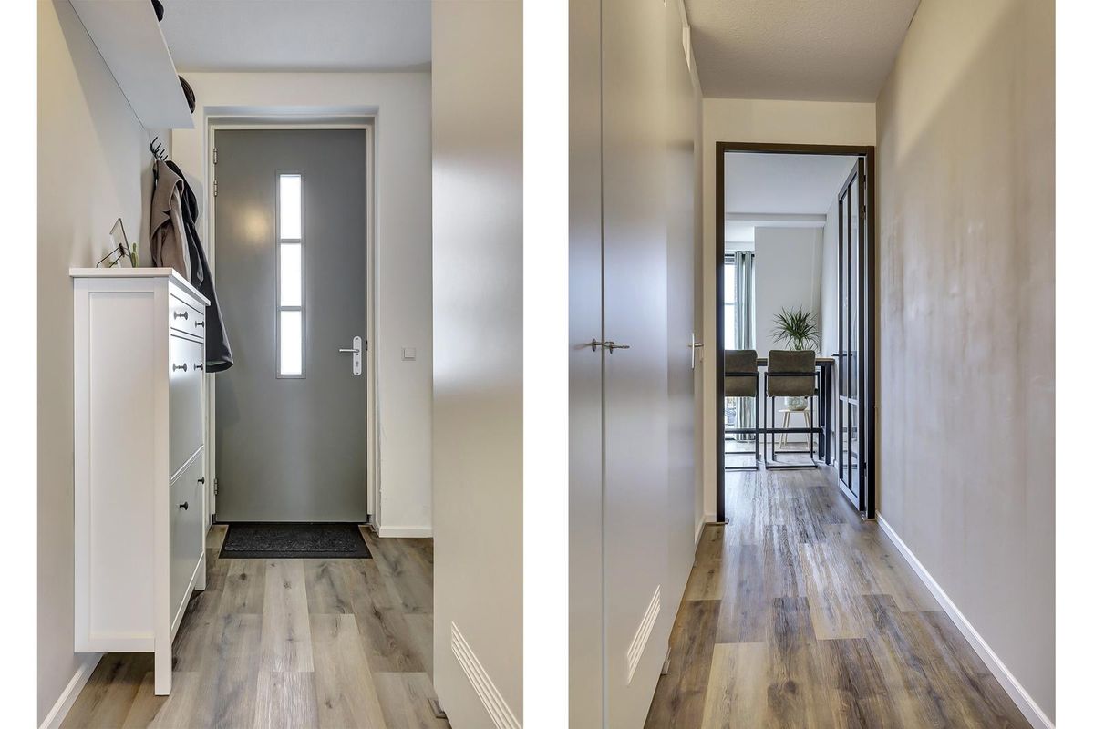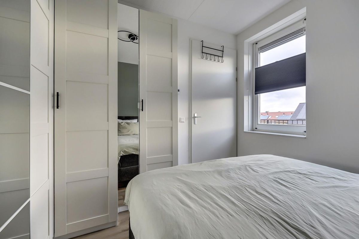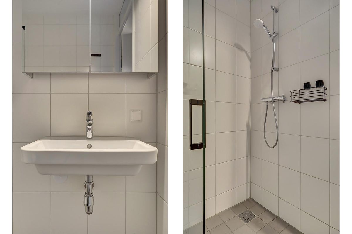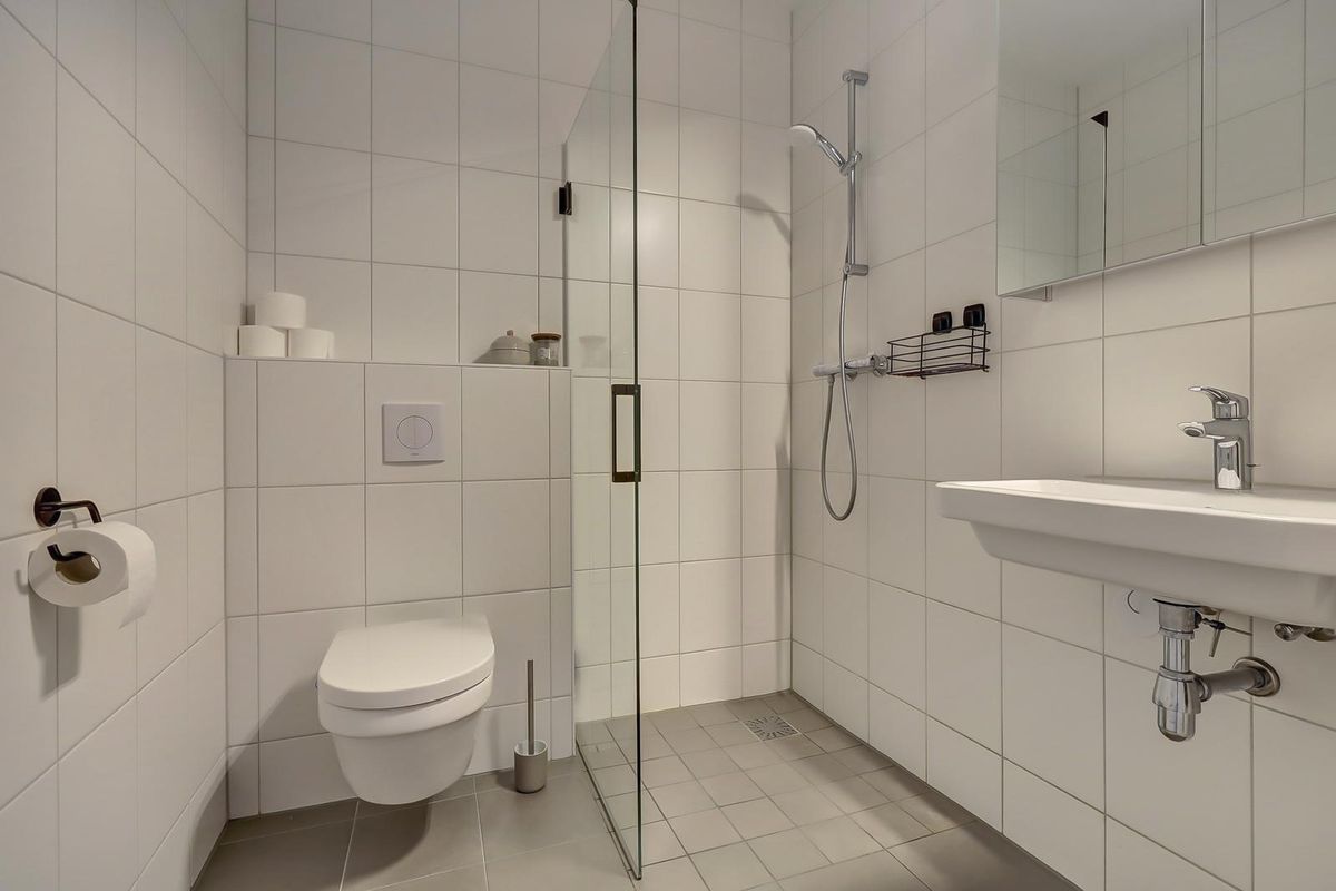 Eenmaal binnen verwelkomt de hal je meteen en leidt je naar de slaapkamer aan de voorzijde, rustig en praktisch ingedeeld. In deze hal vind je ook de meterkast en een handige kast met de unit voor stadsverwarming, netjes weggewerkt. De moderne badkamer is voorzien van een toilet, een douche met glazen scherm, een wastafel en een designradiator.