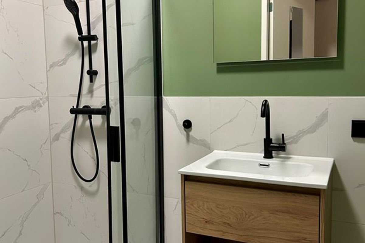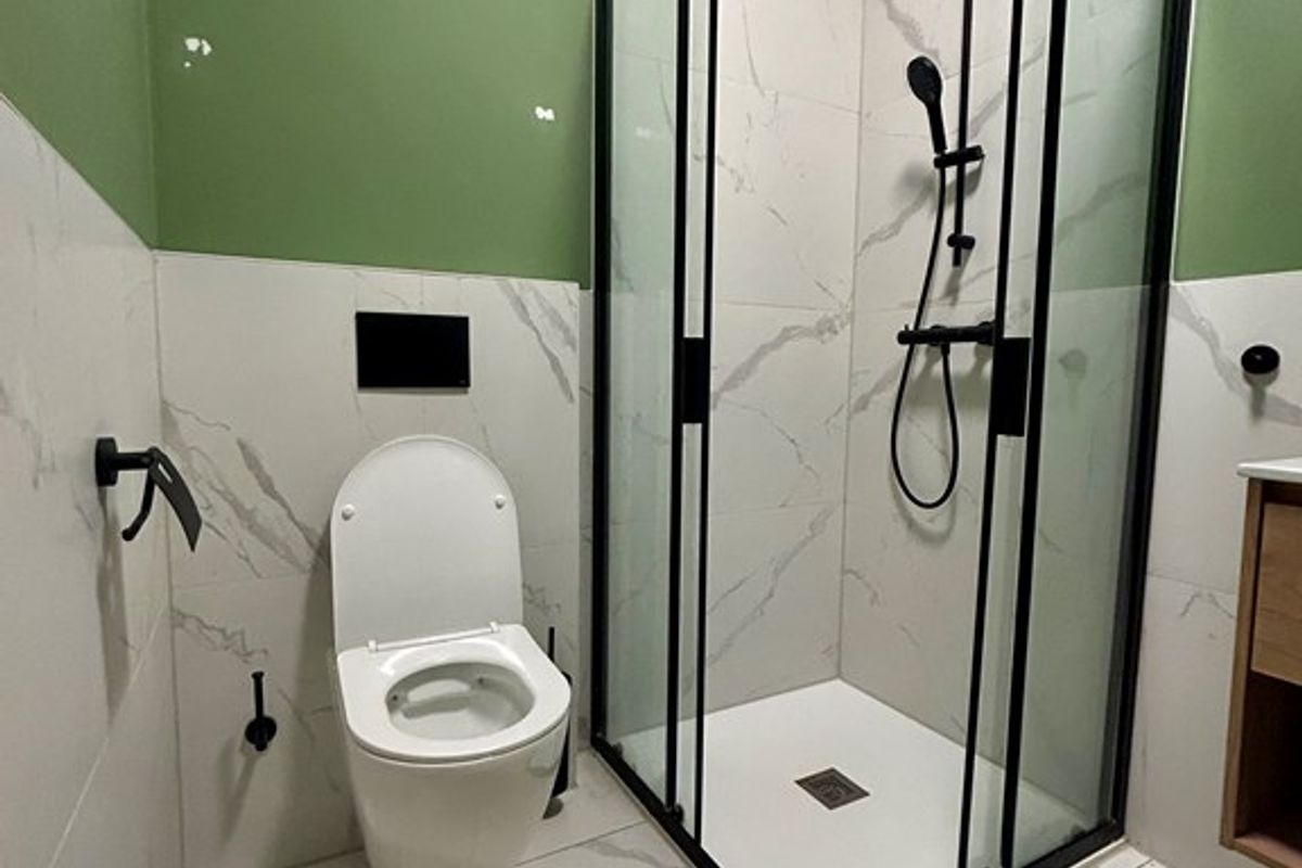 De badkamer is voorzien van een douche, een wastafelmeubel met spiegel en een toilet.