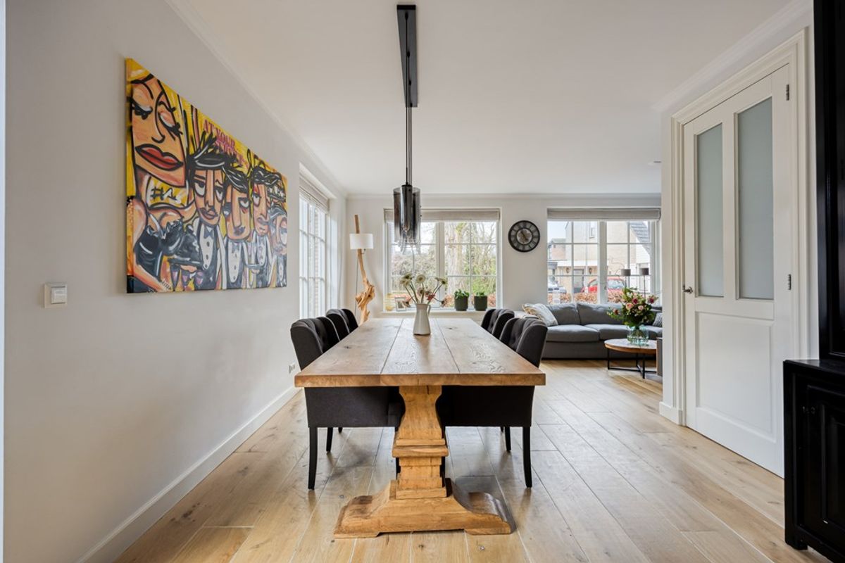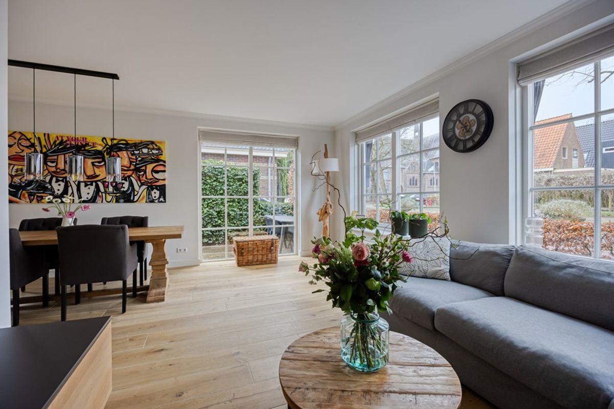 Supergezellige zithoek aan de voorzijde met uitzicht op de ruime straat. Tijdloze Multi-garant houten vloer met vloerverwarming en sjieke hoge plinten. De Meranti hardhouten kozijnen aan de voorzijde en zijkant tot op de vloer (HR++ glas) zijn alle voorzien van roedes, hetgeen erg mooi past bij de sfeer van het huis. Strak gestucte wanden en plafonds en brede vensterbanken maken het geheel af.