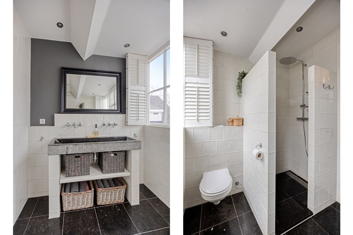 Luxe fijn ingerichte badkamer met inloopdouche met thermostatische regendouche (2024), wastafelmeubel met dubbele inbouwkraan en Belgisch hardstenen wasbak en vloer met een comfortabele vloerverwarming! Het toilet hangt op een discrete plaats in de ruimte. Op de wanden dezelfde witte hoogglans tegels als in de toiletruimte beneden. Praktisch raam waardoor u naast mechanisch ventileren ook natuurlijk kunt ventileren. Met de houten shutters kunt u het daglicht zo instellen als u zelf wilt.
