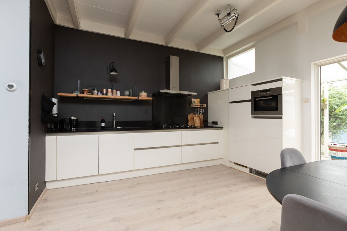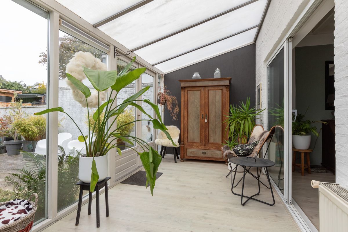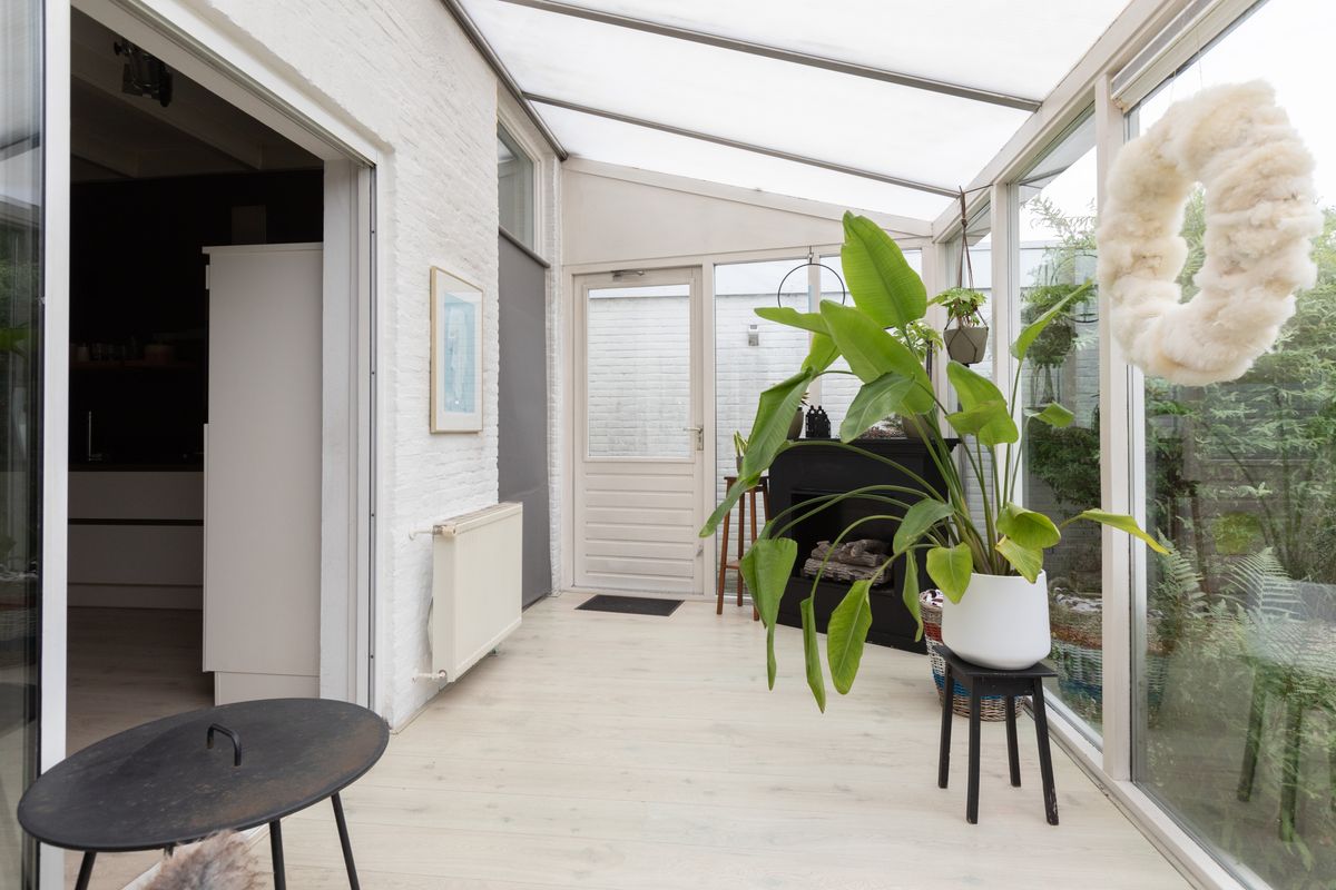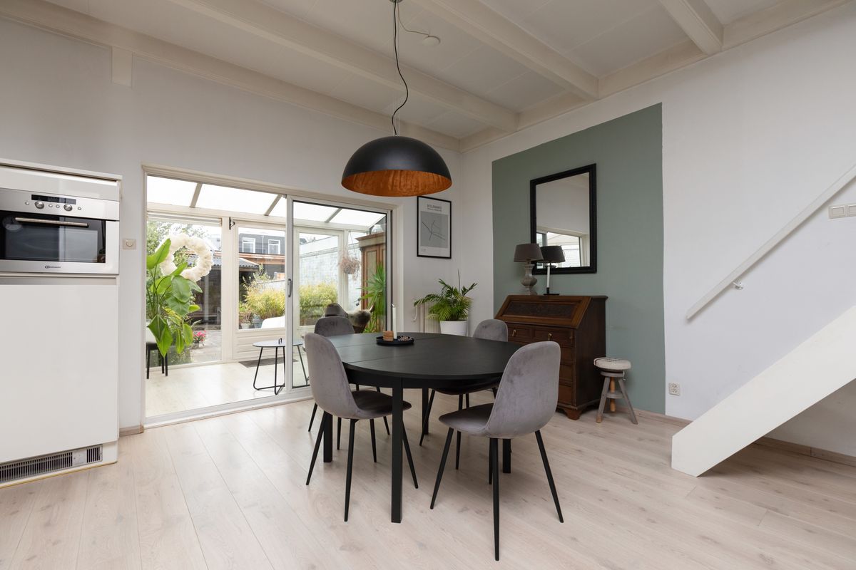 Entree, hal, meterkast, toilet. In de toiletruimte is tevens plaats voor de cv-installatie, de wasmachine en droger. De sfeervolle woonkamer met balkenplafond is uitgevoerd in moderne kleurstellingen en heeft veel lichtinval. De open hoekkeuken heeft veel bergruimte, een lang werkblad en diverse inbouwapparatuur. De grote schuifpui aan de achterzijde geeft toegang naar de aangebouwde serre. Hier kan men, doormiddel van de openslaande deuren, heerlijk beschut genieten van de achtertuin. De ruime achtertuin met houten bergschuur en overkapping beschikt over een achterom via de zijkant van de woning. De tuin heeft een zonligging op het noorden maar door de diepte van de tuin is er een goede zonligging.