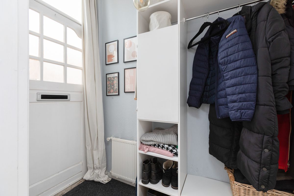 De beschutte achtertuin op het noorden heeft een vrij achterom via de zijkant van de woning. De tuin is voorzien van bestrating, borders met vaste planten, een paar fruitbomen, een houten berging en een overkapping.