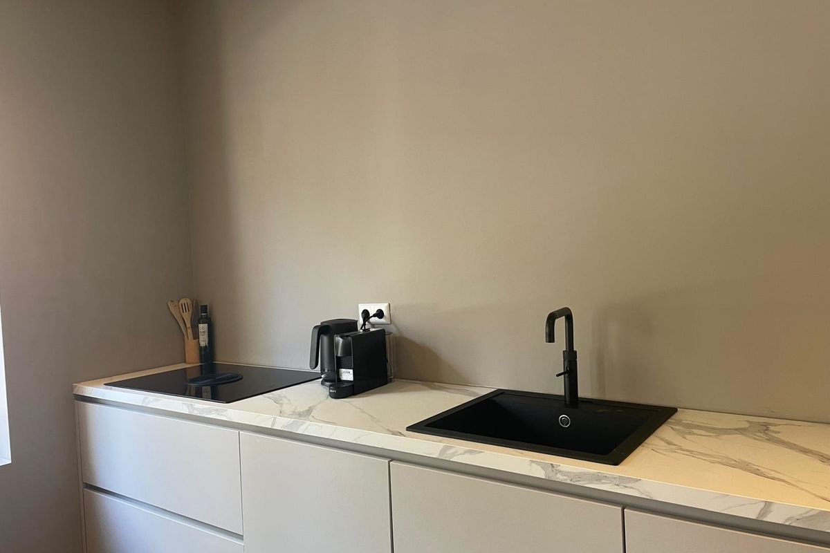 First floor: private entrance, hallway. On the frontside of the apartment the living with open kitchen is situated, the luxurious kitchen is equipped with all built in appliances such as a frigde with freezer, combi oven microwave, sink, cooker, 4 heater electric stove with built in extractorfan and a dishwasher. Thanks to the big windows the living is very bright. Modern bathroom with toilet, washing stand, floor heating and step in shower. Separate closet with mechanic ventilation system, boiler for hot water and washing machine + dryer. Masterbedroom on the backside of the apartment with access to the sunny balcony facing North West. The second bedroom is also on the backside and has access to the balcony.