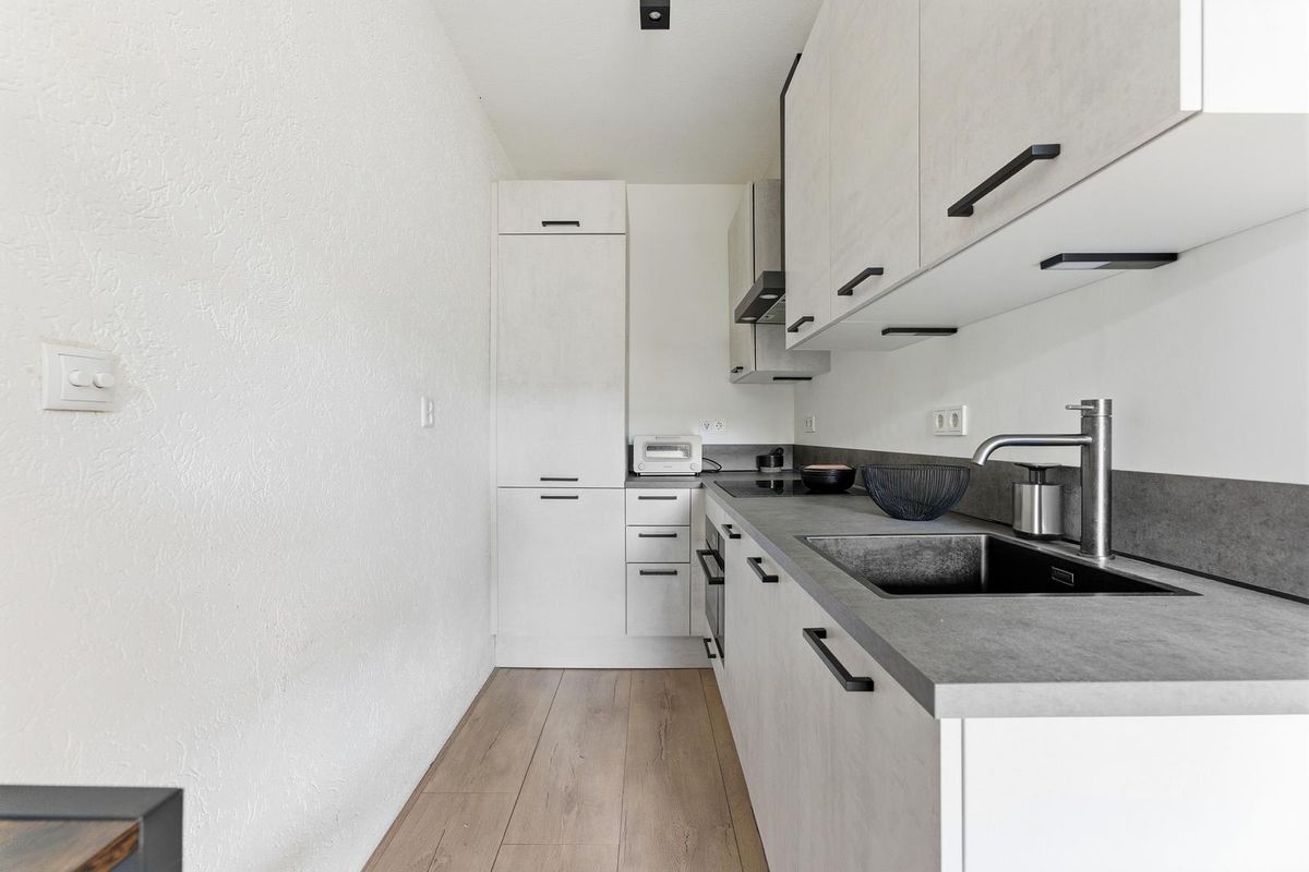 De slaapkamer, gelegen aan de voorzijde, beschikt over een vaste kledingkast. De badkamer is praktisch ingedeeld en uitgerust met een douche, toilet, wastafel met meubel en aansluiting voor de wasmachine. De berging bevindt zich direct naast de woning en is van buitenaf bereikbaar, ideaal voor fietsen en extra opslagruimte.