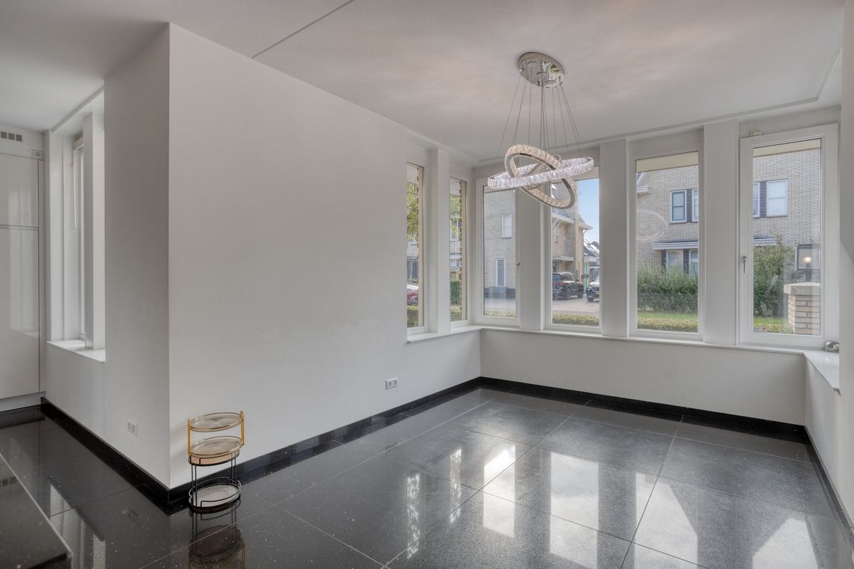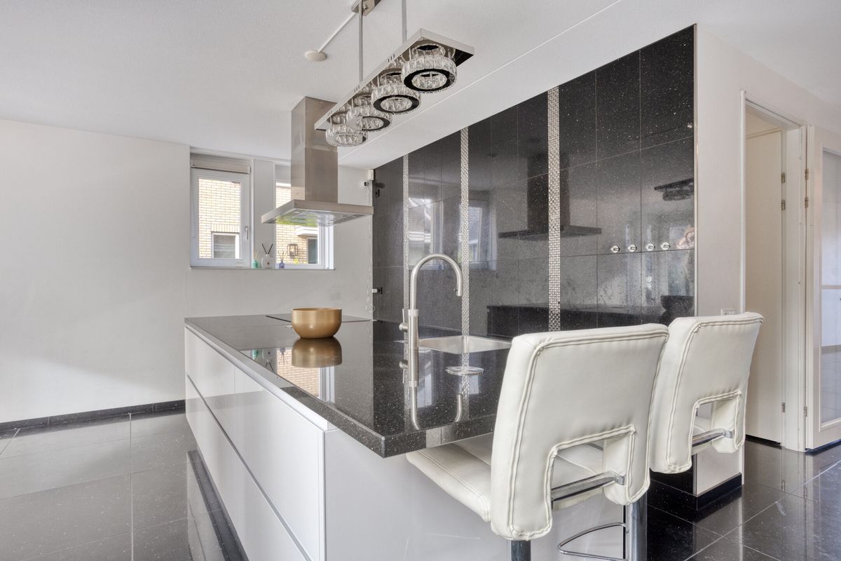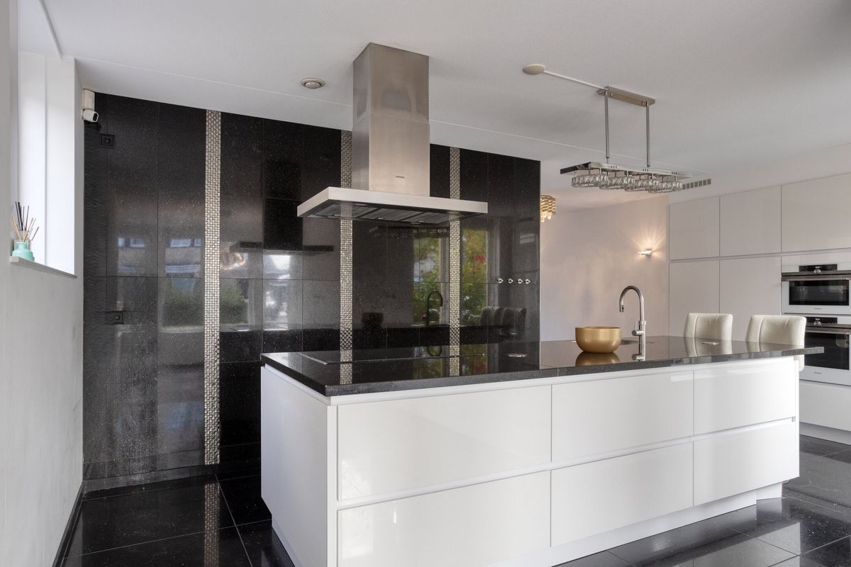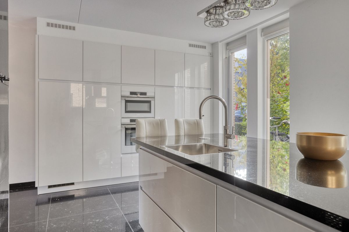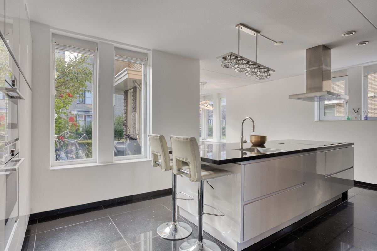 De moderne keuken is een waar pronkstuk: strak vormgegeven, voorzien van een royaal kookeiland en uitgerust met hoogwaardige Siemens-apparatuur. Hier vindt u alles wat u zich kunt wensen: vaatwasser, inductie, afzuiging, oven, magnetron, koelkast, vriezer én een kokend waterkraan. Dankzij de grote erker is het eetgedeelte heerlijk licht en sfeervol.