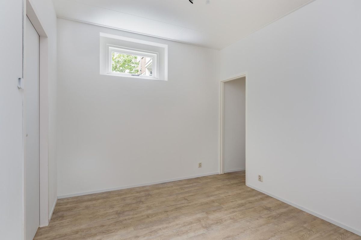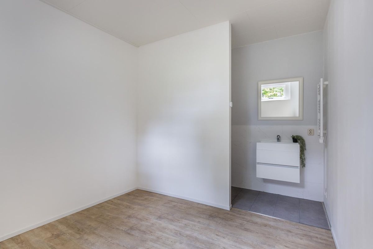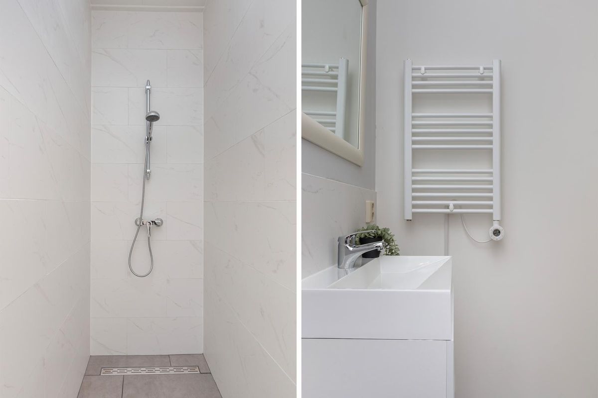 Aan de achterzijde vind je de rustig gelegen slaapkamer, met genoeg ruimte voor een tweepersoonsbed en een kledingkast. Aangrenzend bevindt zich een open verbinding naar de moderne badkamer met een inloopdouche en wastafel. Een plek die strak, praktisch en fris aanvoelt en helemaal past bij het vernieuwde karakter van de woning. Daarnaast is er een aparte hoek met de aansluiting voor de wasmachine, netjes weggewerkt uit het zicht.