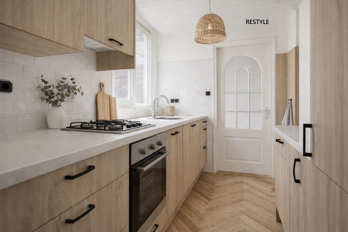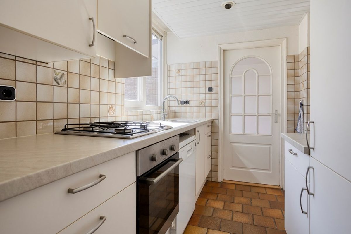De afgesloten keuken is praktisch ingericht met een langwerpig aanrechtblad en diverse inbouwapparatuur. U beschikt hier over een gasfornuis met oven, een afzuigkap, een vaatwasmachine en een koelkast. Daarnaast is er voldoende opbergruimte aanwezig. Hoewel de keuken functioneel is, heeft u tevens de mogelijkheid om deze geheel naar eigen wens te moderniseren.
