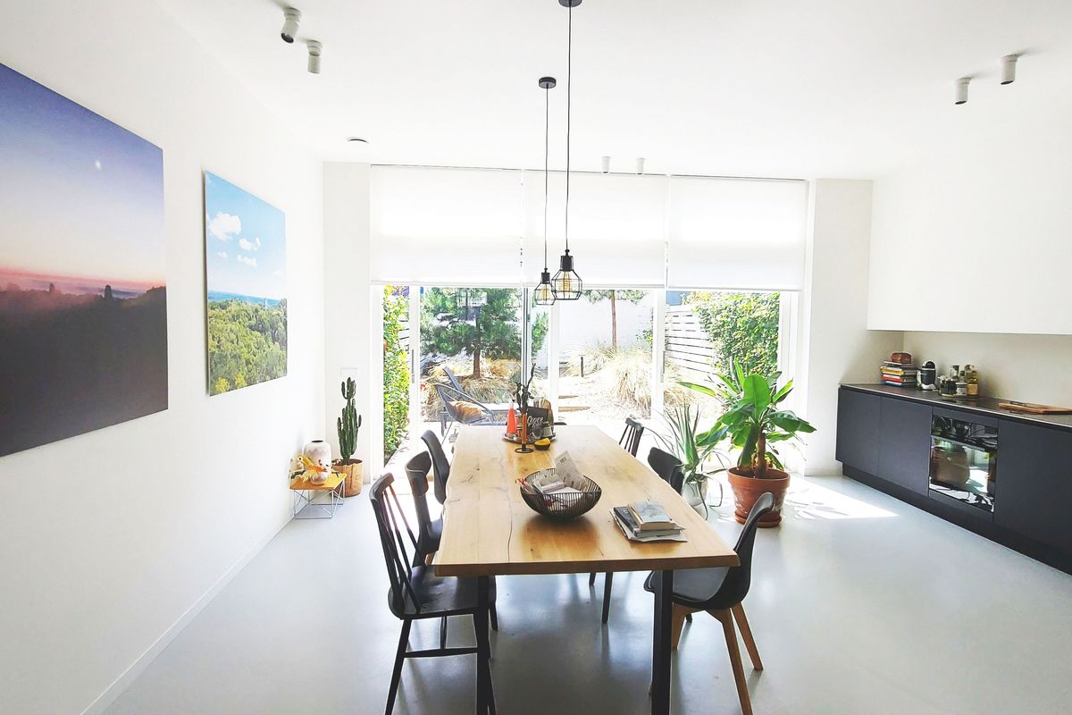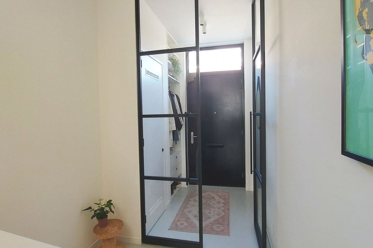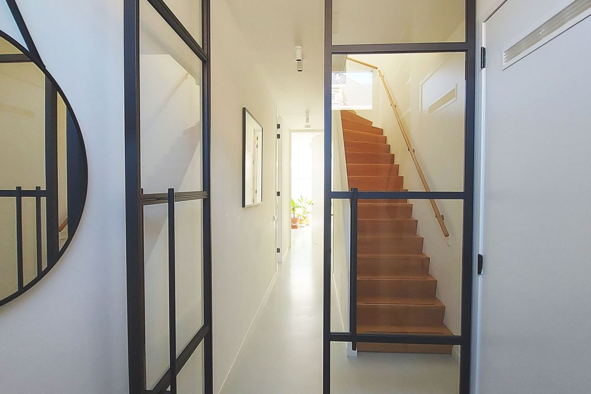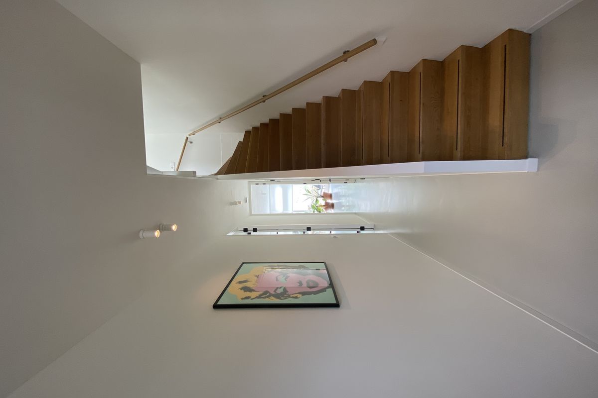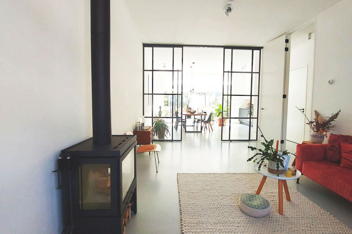 Entrance with cloakroom behind the door and meter cupboard. Through 2 steel pivot doors you enter the hall with access to the living room, kitchen, toilet, storage room with separate freezer and stairs to the 1st floor. The living room is located at the front of the house and features a cosy wood burning fireplace and a cast floor with underfloor heating and is connected by magnificent steel en-suite doors to the spacious and luxurious living kitchen. The modern kitchen is equipped with various built-in appliances (induction hob, dishwasher, oven, extractor hood, fridge and wine fridge) and sliding doors with access to the south-facing garden (6 x 9).
