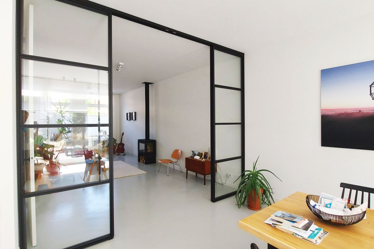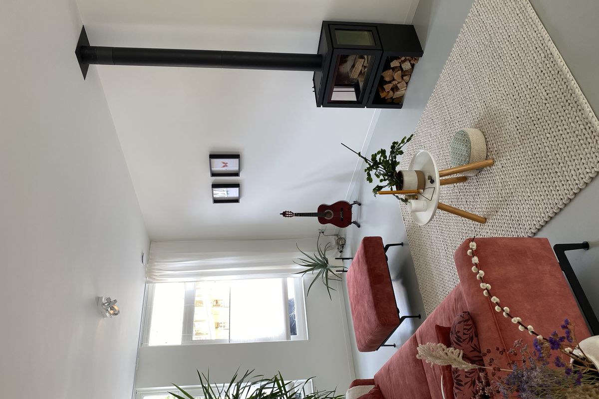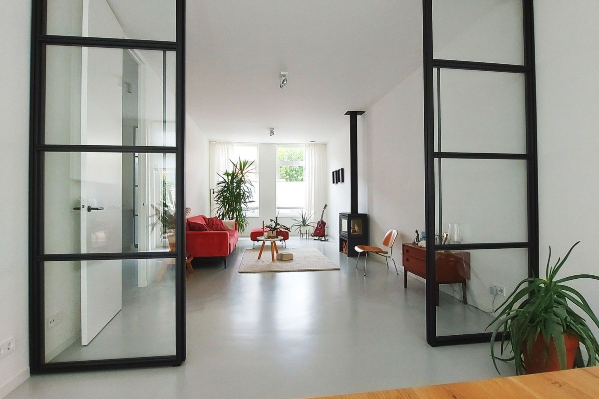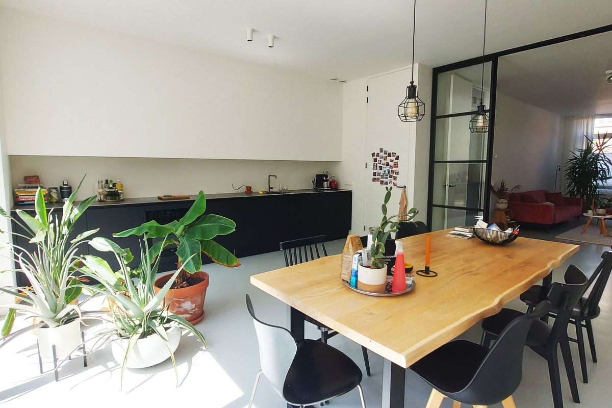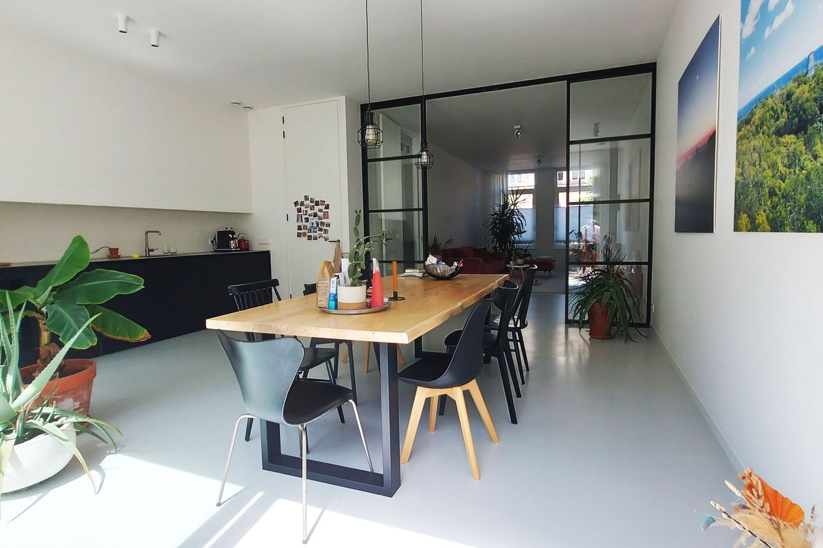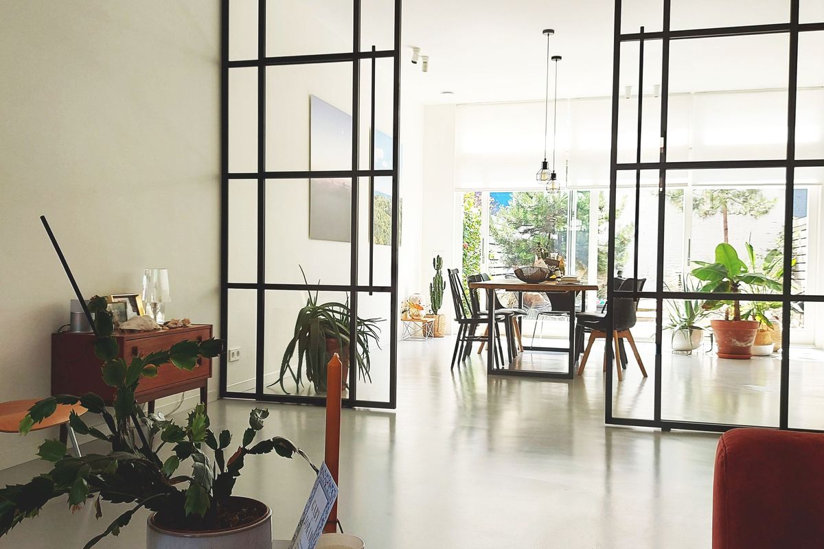 Entrance with cloakroom behind the door and meter cupboard. Through 2 steel pivot doors you enter the hall with access to the living room, kitchen, toilet, storage room with separate freezer and stairs to the 1st floor. The living room is located at the front of the house and features a cosy wood burning fireplace and a cast floor with underfloor heating and is connected by magnificent steel en-suite doors to the spacious and luxurious living kitchen. The modern kitchen is equipped with various built-in appliances (induction hob, dishwasher, oven, extractor hood, fridge and wine fridge) and sliding doors with access to the south-facing garden (6 x 9).