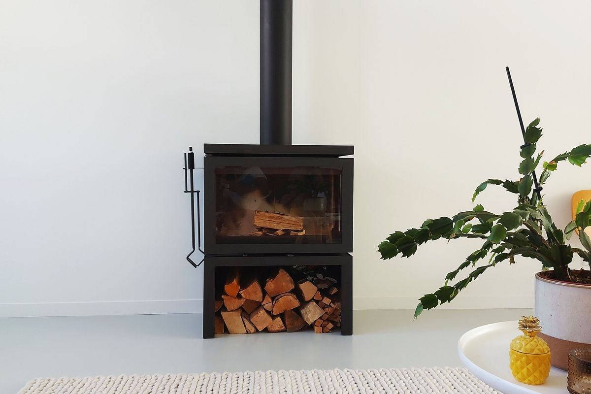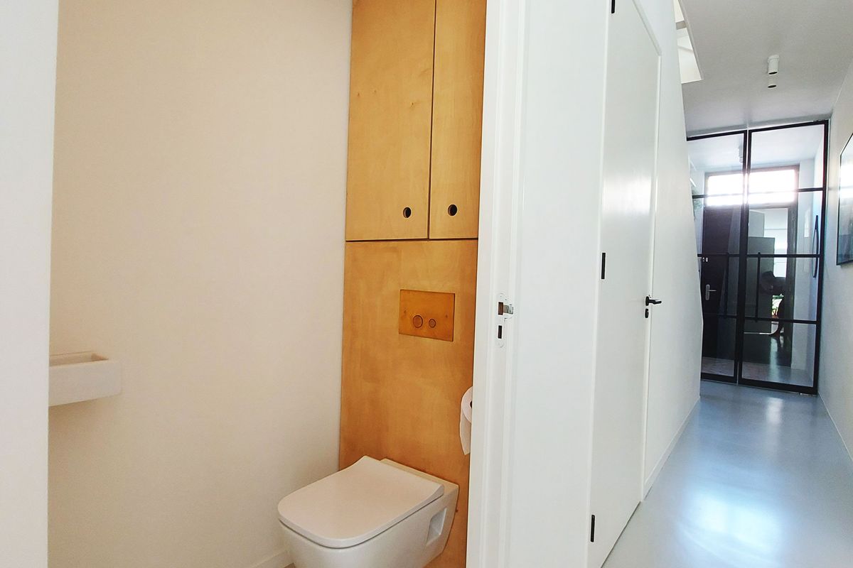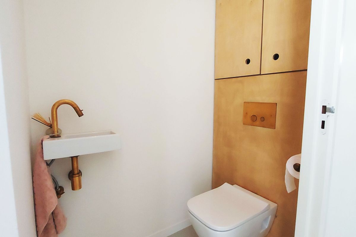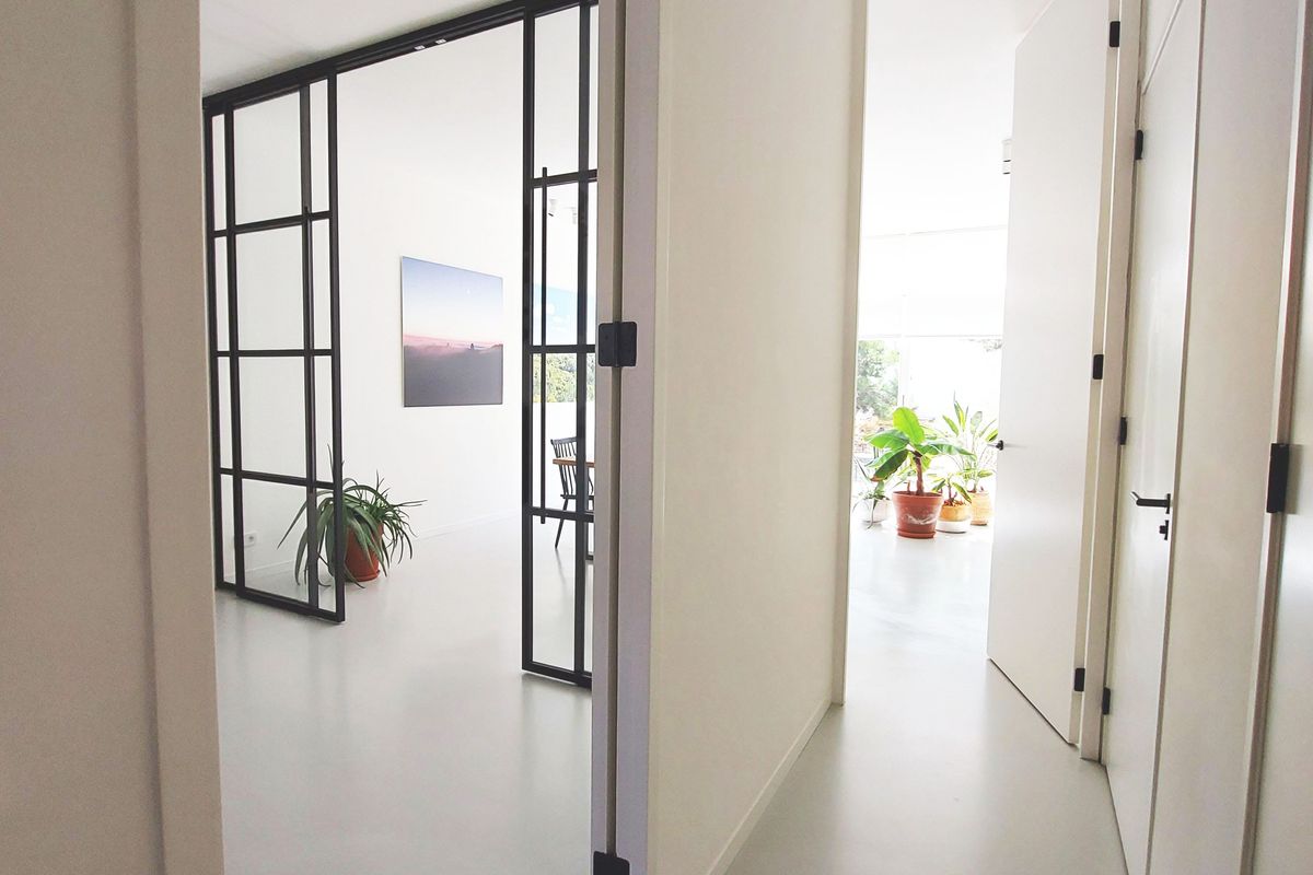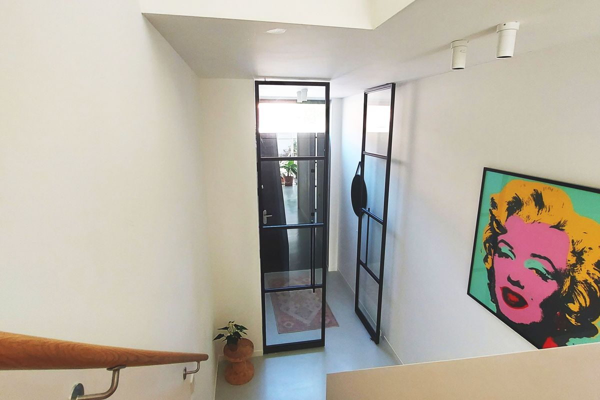 Entrance with cloakroom behind the door and meter cupboard. Through 2 steel pivot doors you enter the hall with access to the living room, kitchen, toilet, storage room with separate freezer and stairs to the 1st floor. The living room is located at the front of the house and features a cosy wood burning fireplace and a cast floor with underfloor heating and is connected by magnificent steel en-suite doors to the spacious and luxurious living kitchen. The modern kitchen is equipped with various built-in appliances (induction hob, dishwasher, oven, extractor hood, fridge and wine fridge) and sliding doors with access to the south-facing garden (6 x 9).