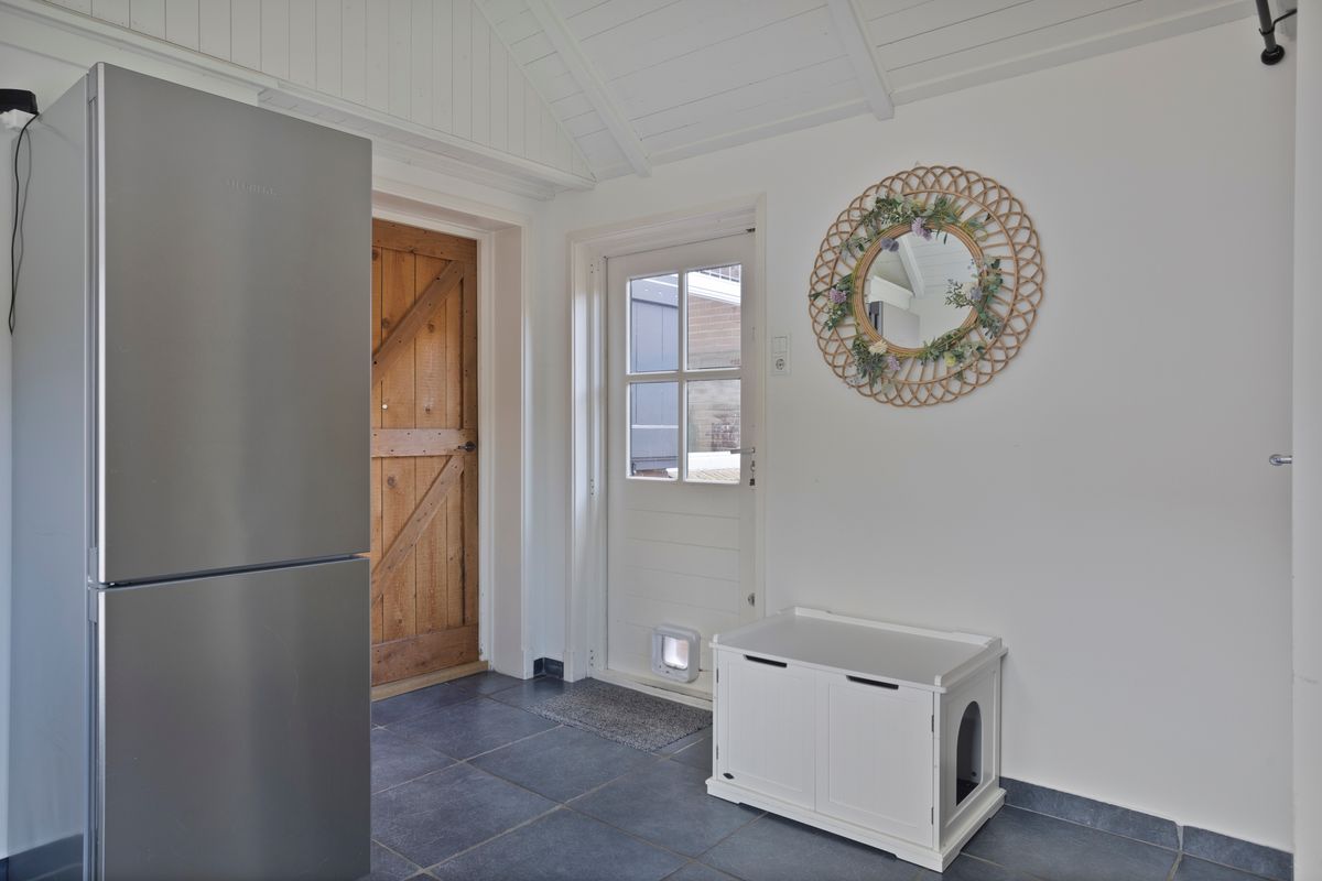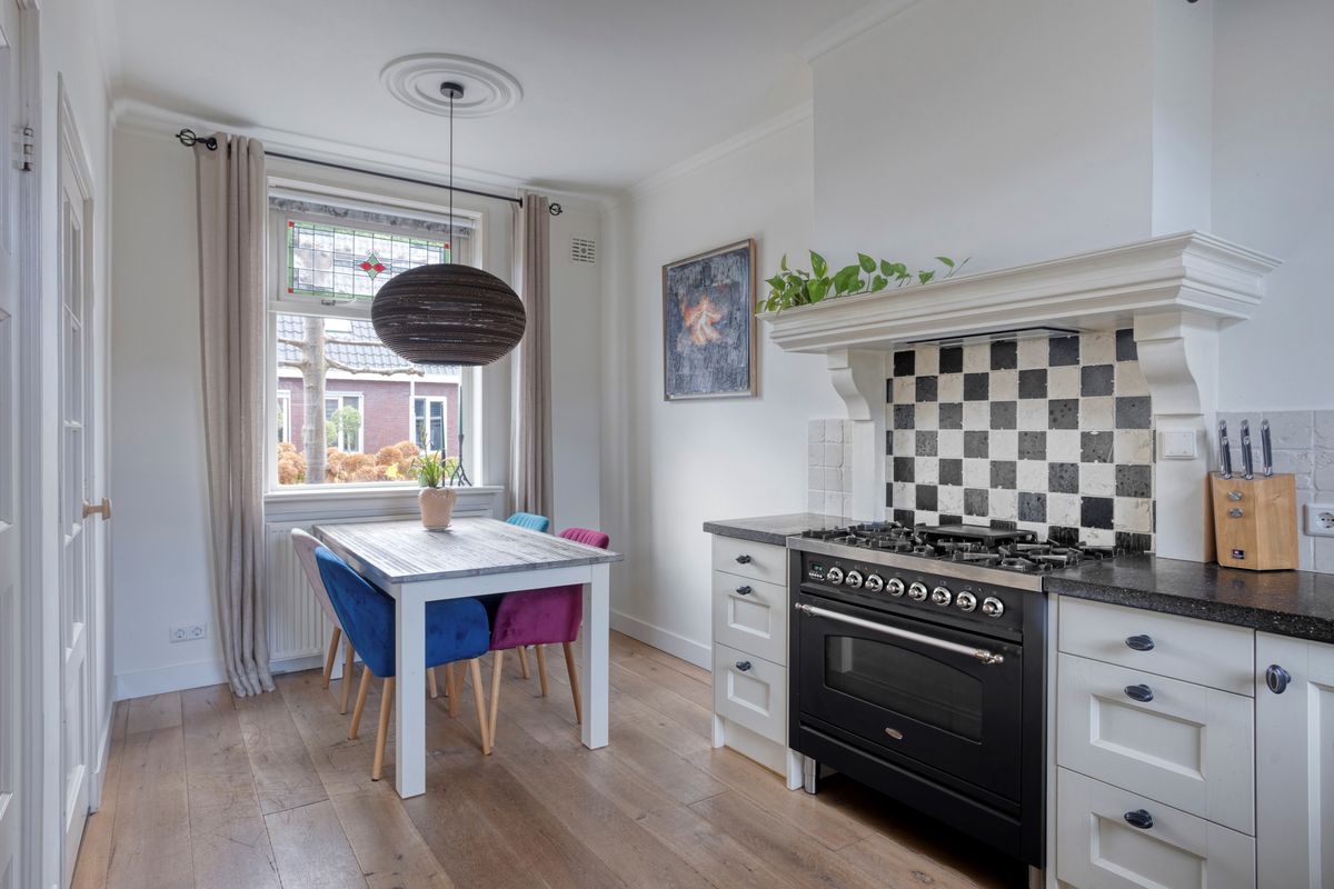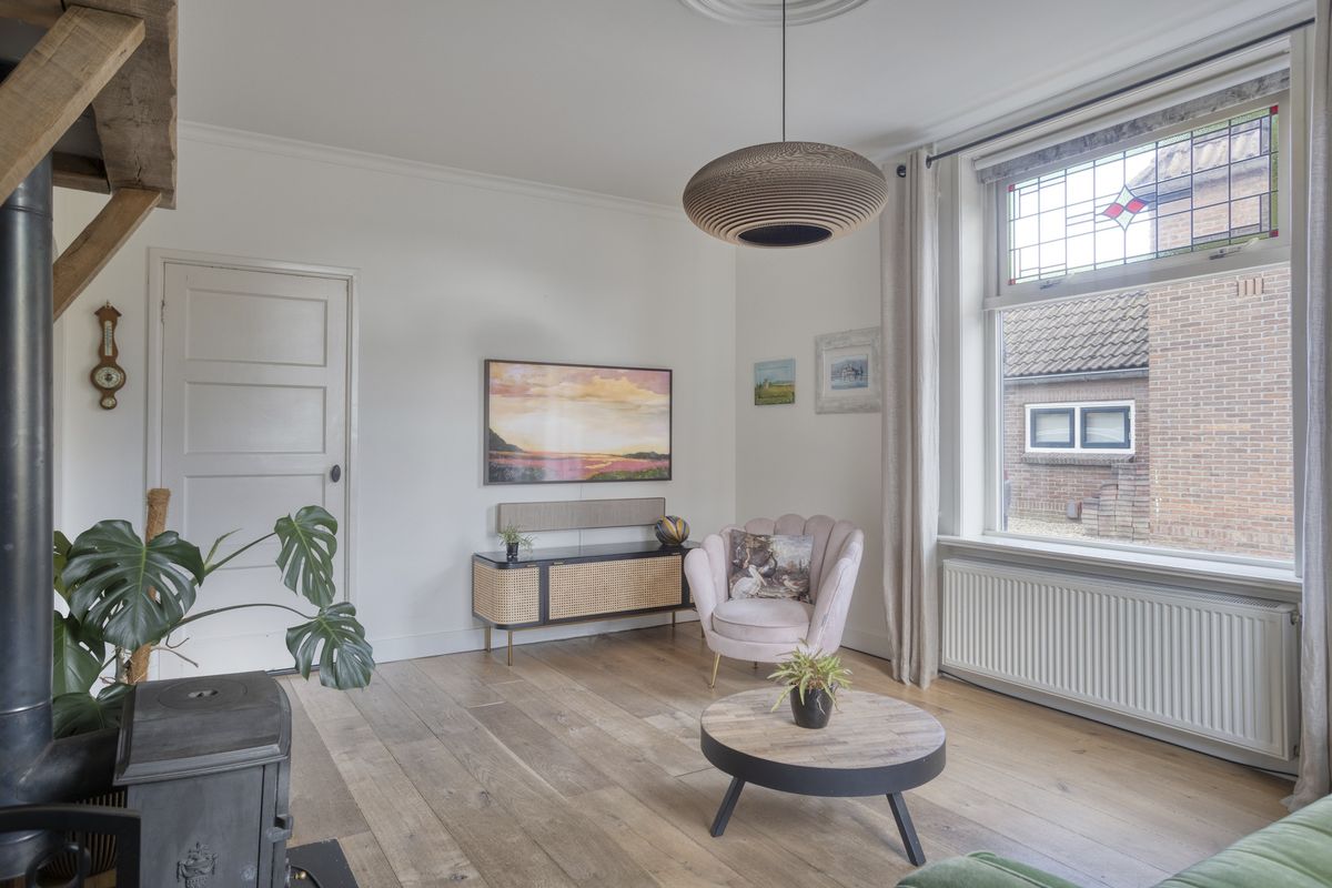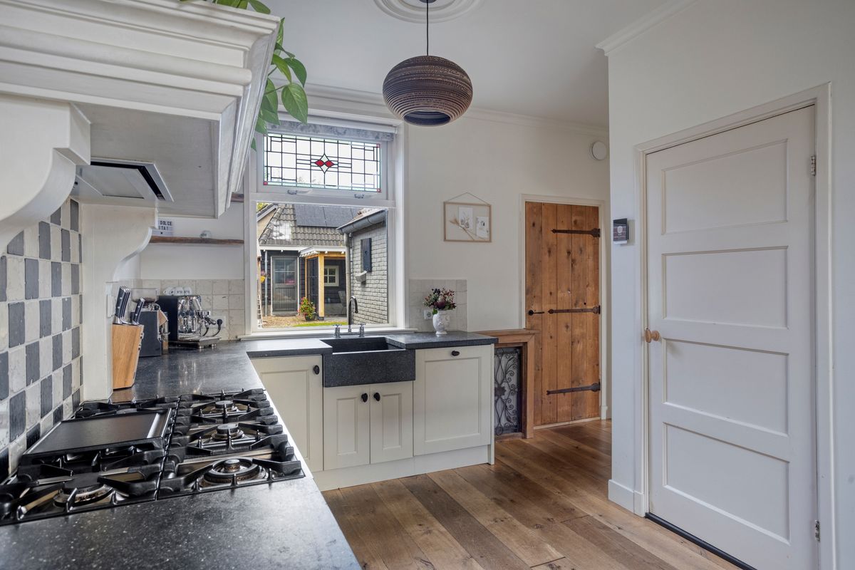 De karaktervolle voordeur biedt toegang tot entree met trapopgang, meterkast en toegang tot de woonkamer. De gezellige woonkamer is voorzien van een massief eikenhouten vloer, houtkachel en vaste kast en vormt een sfeervol geheel. De landelijke eetkeuken met hoekinbouwkeuken is uitgerust met diverse apparatuur, waaronder een Boretti 6-pits fornuis met brede oven. Het terrazzo werkblad, de massieve spoelunit, handgemaakte afzuigschouw en nostalgische tegeltjes geven de ruimte een uniek karakter. Twee praktische servieskasten zorgen voor extra bergruimte, en via de keuken bereik je ook de kelder. Aansluitend vind je de grote bijkeuken, met toiletruimte (recent vernieuwd), witgoedaansluitingen, de C.V.-opstelling en volop extra bergruimte. De antracietkleurige plavuizenvloer maakt het geheel praktisch én stijlvol.