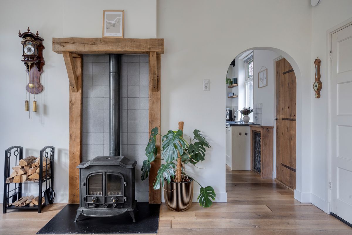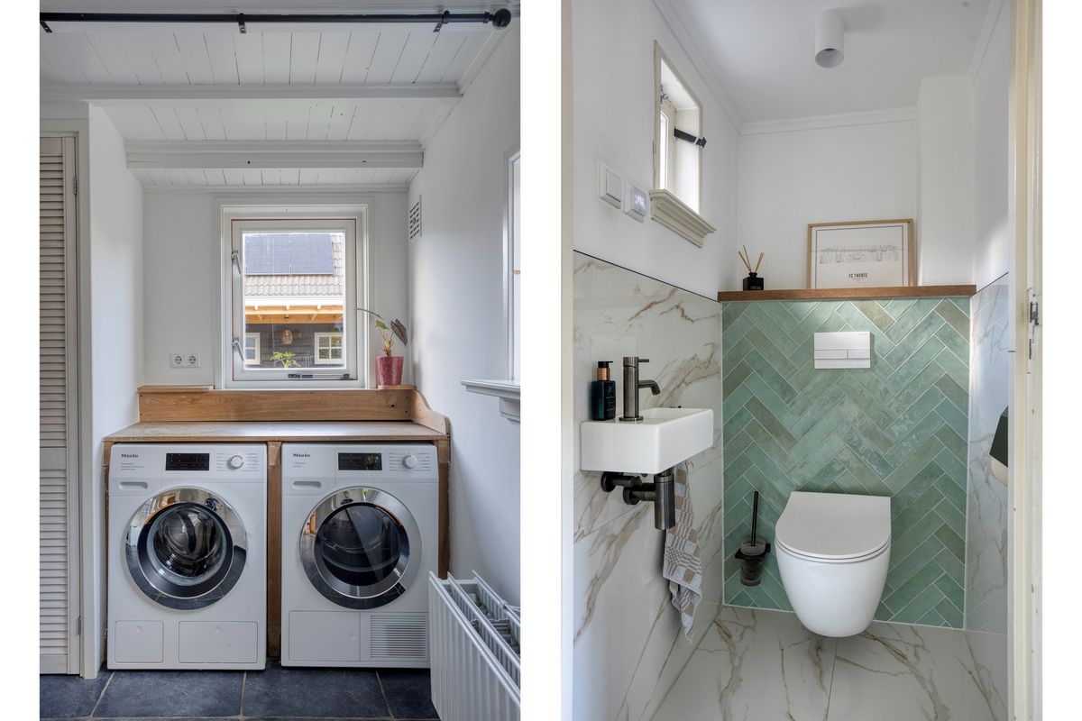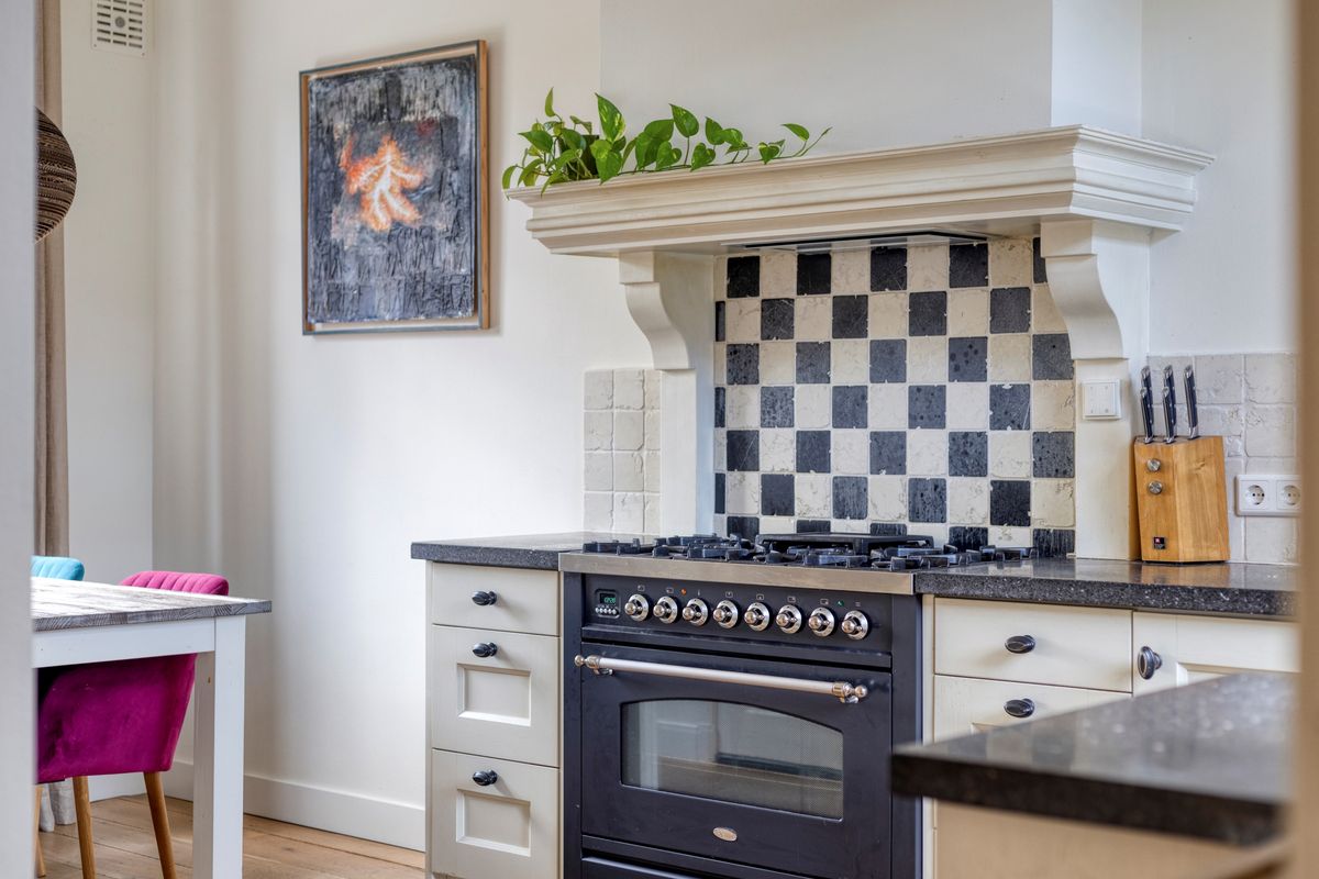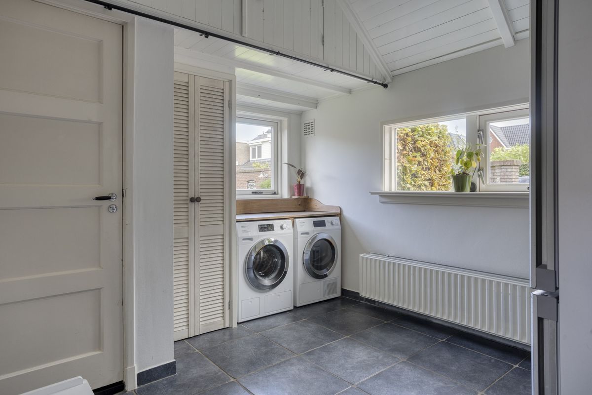 De karaktervolle voordeur biedt toegang tot entree met trapopgang, meterkast en toegang tot de woonkamer. De gezellige woonkamer is voorzien van een massief eikenhouten vloer, houtkachel en vaste kast en vormt een sfeervol geheel. De landelijke eetkeuken met hoekinbouwkeuken is uitgerust met diverse apparatuur, waaronder een Boretti 6-pits fornuis met brede oven. Het terrazzo werkblad, de massieve spoelunit, handgemaakte afzuigschouw en nostalgische tegeltjes geven de ruimte een uniek karakter. Twee praktische servieskasten zorgen voor extra bergruimte, en via de keuken bereik je ook de kelder. Aansluitend vind je de grote bijkeuken, met toiletruimte (recent vernieuwd), witgoedaansluitingen, de C.V.-opstelling en volop extra bergruimte. De antracietkleurige plavuizenvloer maakt het geheel praktisch én stijlvol.