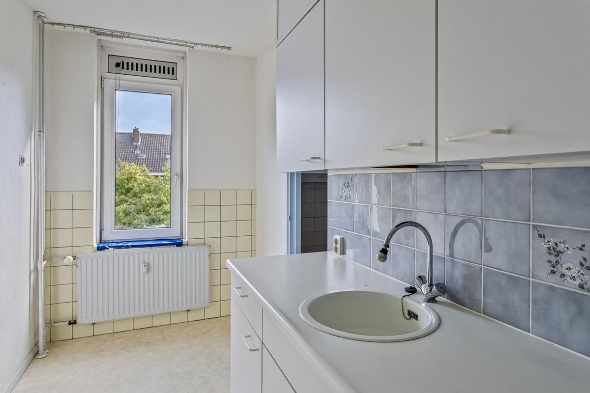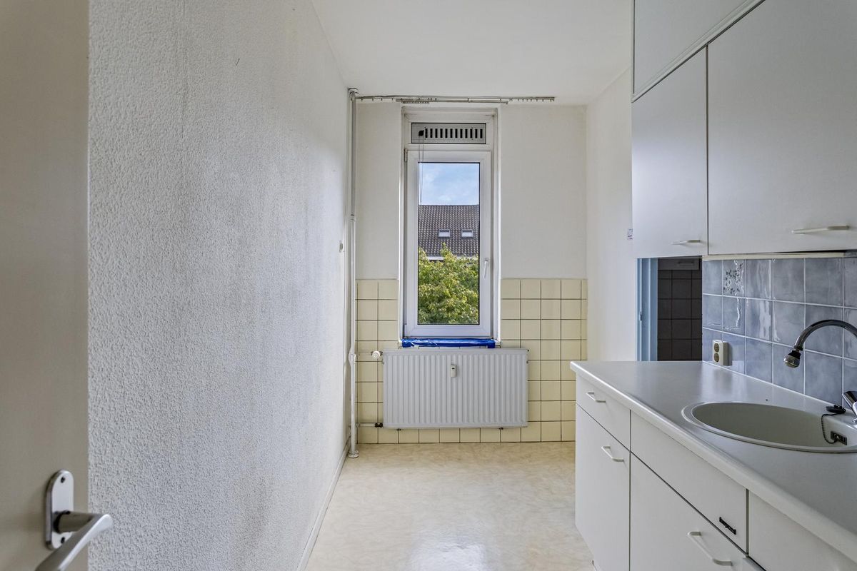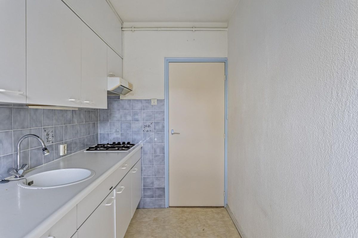 De gesloten keuken (7m²) is v.v. een eenvoudige en oudere Bruynzeel keuken, zonder apparatuur.