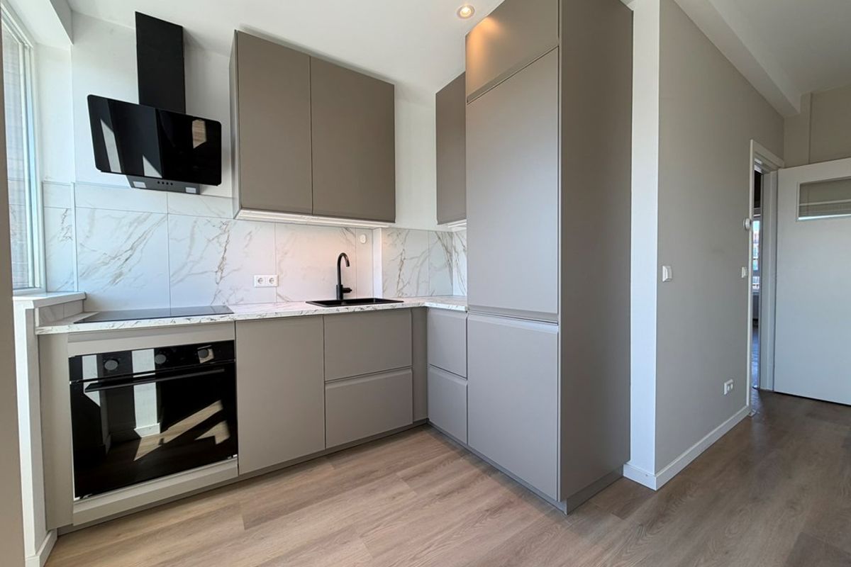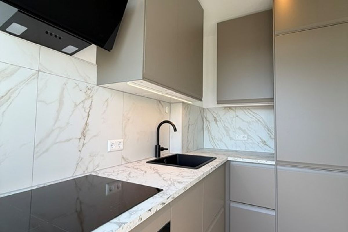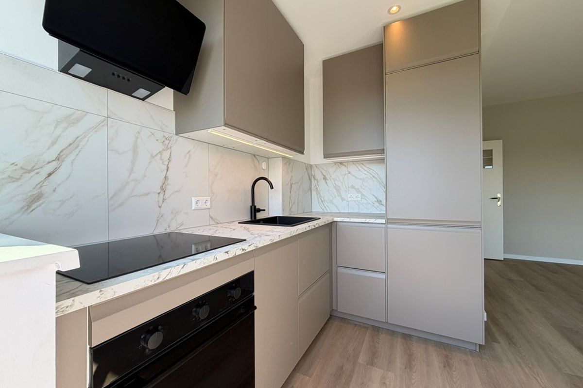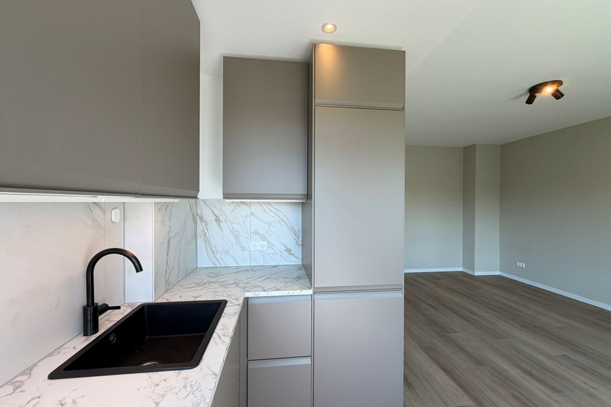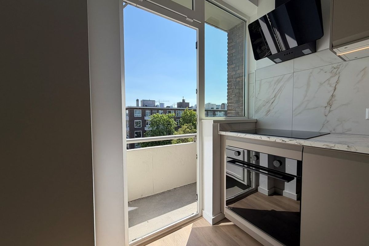 De keuken is voorzien van een moderne keuken met onder andere een koelkast met vriesvak, oven, kookplaat en vaatwasser. De keuken biedt toegang tot het balkon aan de voorzijde.
