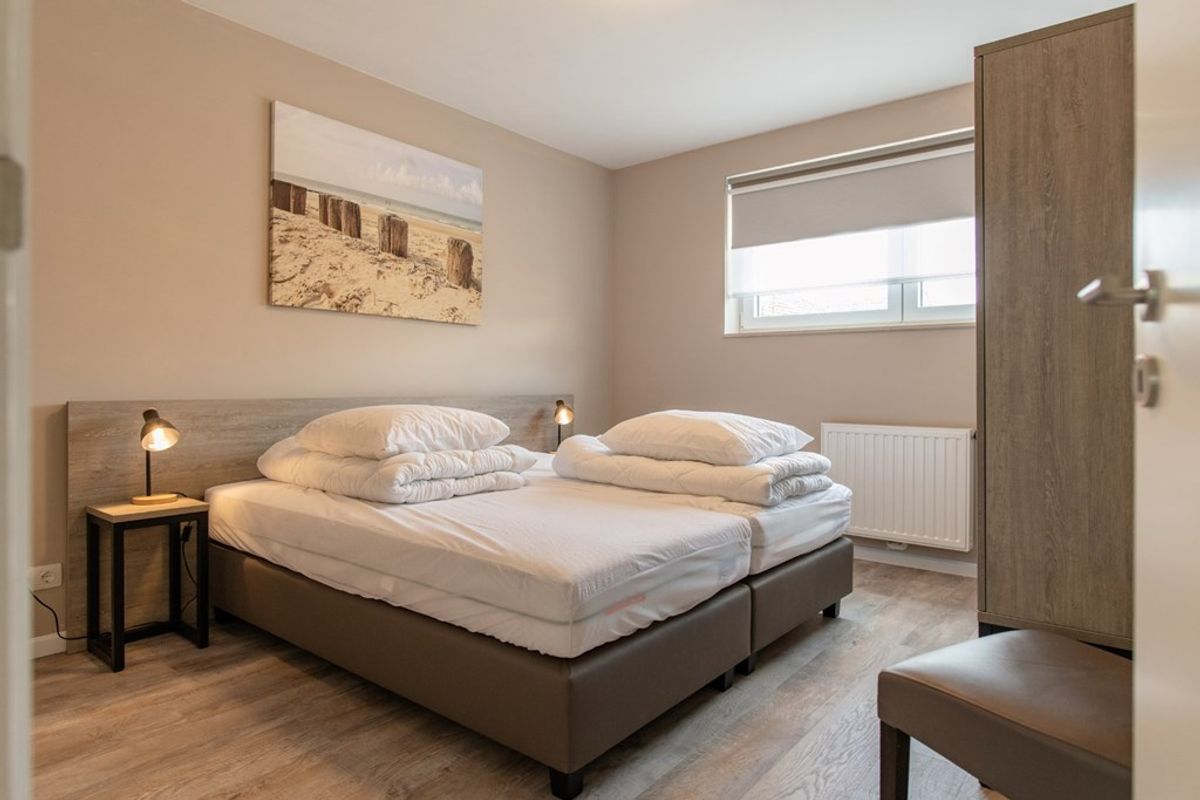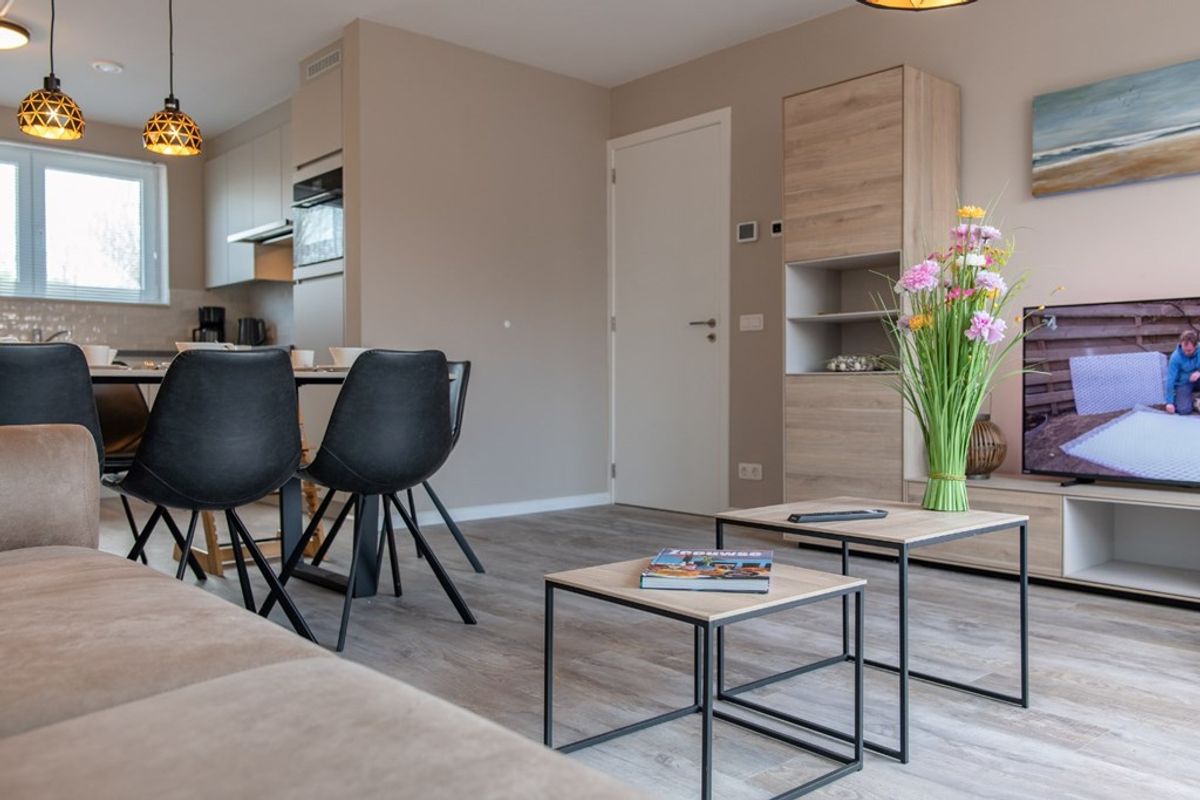 Via de entree komt u in de hal met meterkast en ruimte voor de garderobe. Vanuit de hal is er toegang tot de badkamer, een toilet met fonteintje, de slaapkamer op de begane grond en de woonkamer. De badkamer is voorzien van inloopdouche en dubbele wastafel. De woonkamer met zit- en eethoek heeft een schuifdeur naar het terras en staat in open verbinding met de keuken. Deze moderne keuken in hoekopstelling is voorzien van alle nodige en geïntegreerde inbouwapparatuur zoals 4 pits- inductie kookplaat, afzuigkap, dubbele spoelbak, vaatwasmachine, koelkast en combi-magnetron.