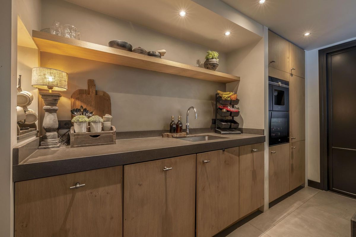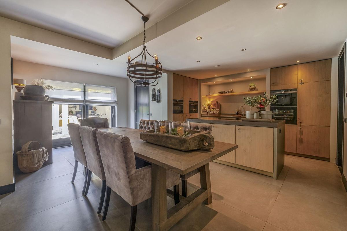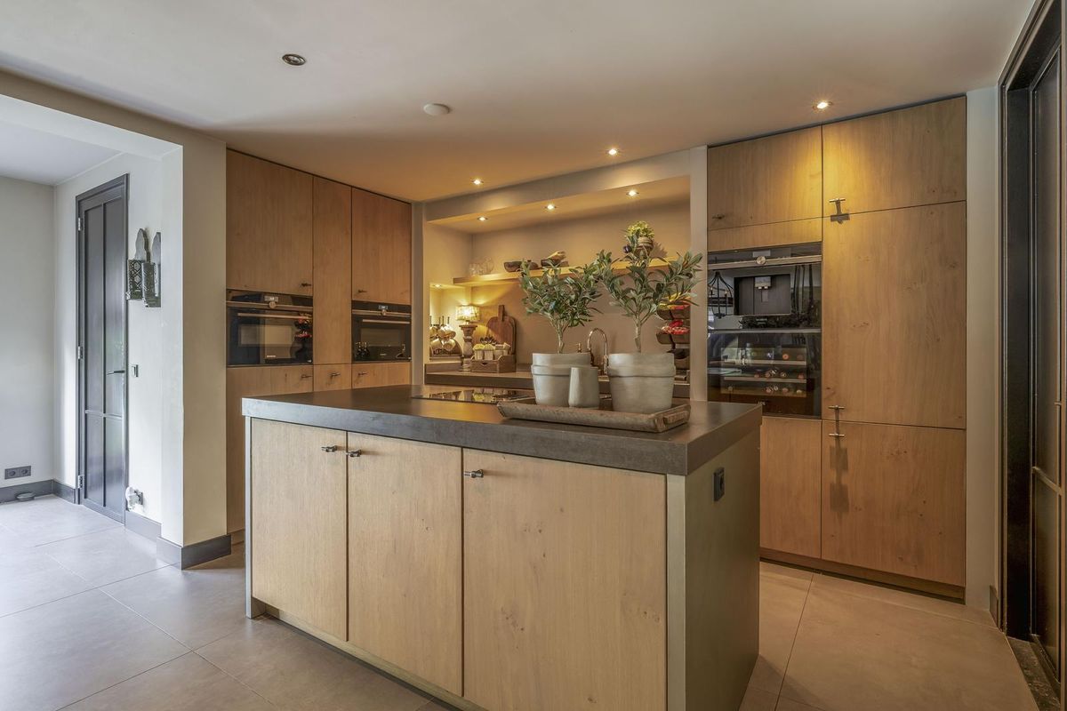 De royale, eiken houten, leefkeuken (ca. 35m²) is voorzien van een kookeiland met inductiekookplaat met geïntegreerde afzuiging, een Quooker, stoomoven, combi oven/magnetron, koelkast, diepvries, vaatwasser, koffiezetapparaat en wijnkoeler. De schuifpui (met hor) biedt directe toegang tot de tuin.