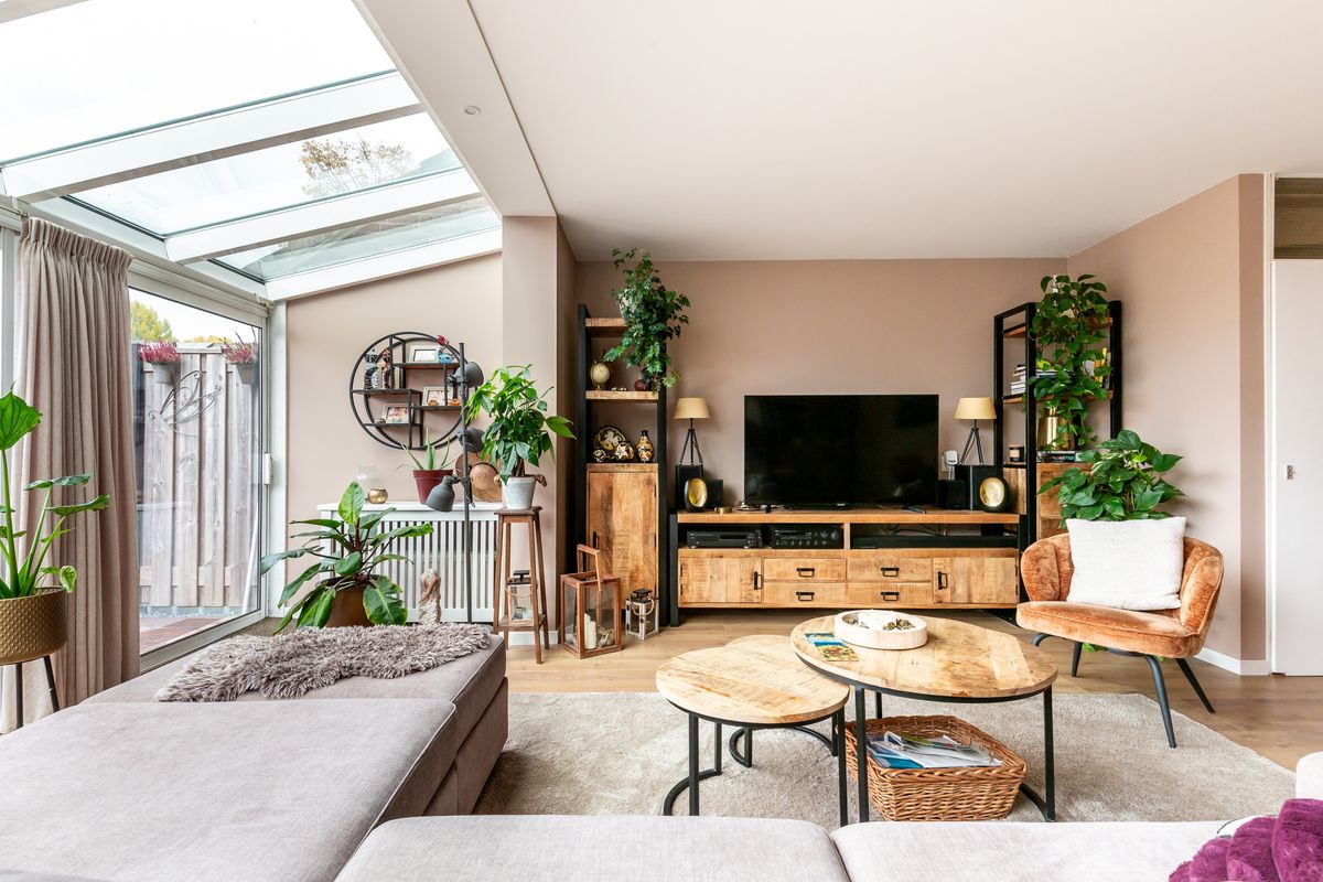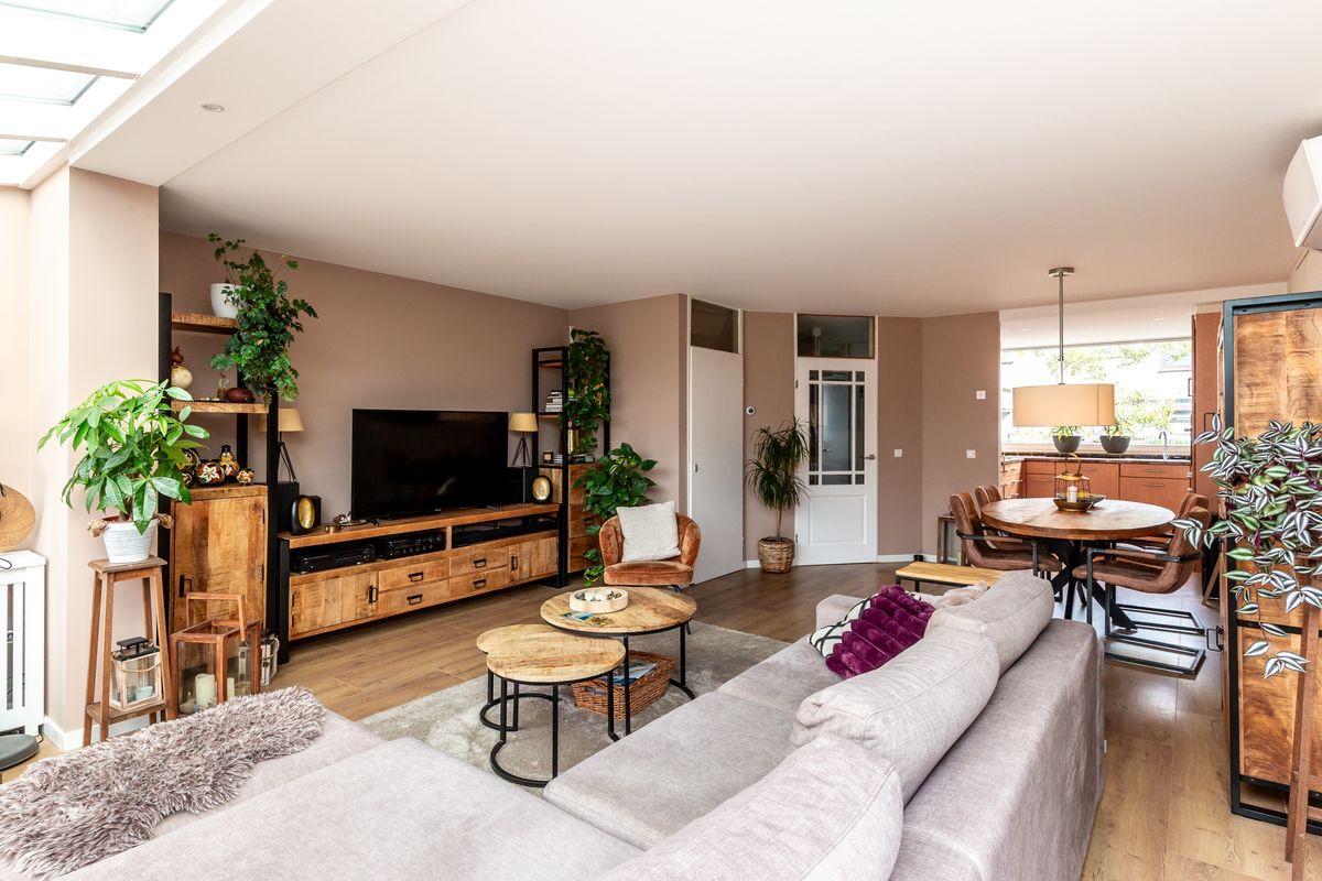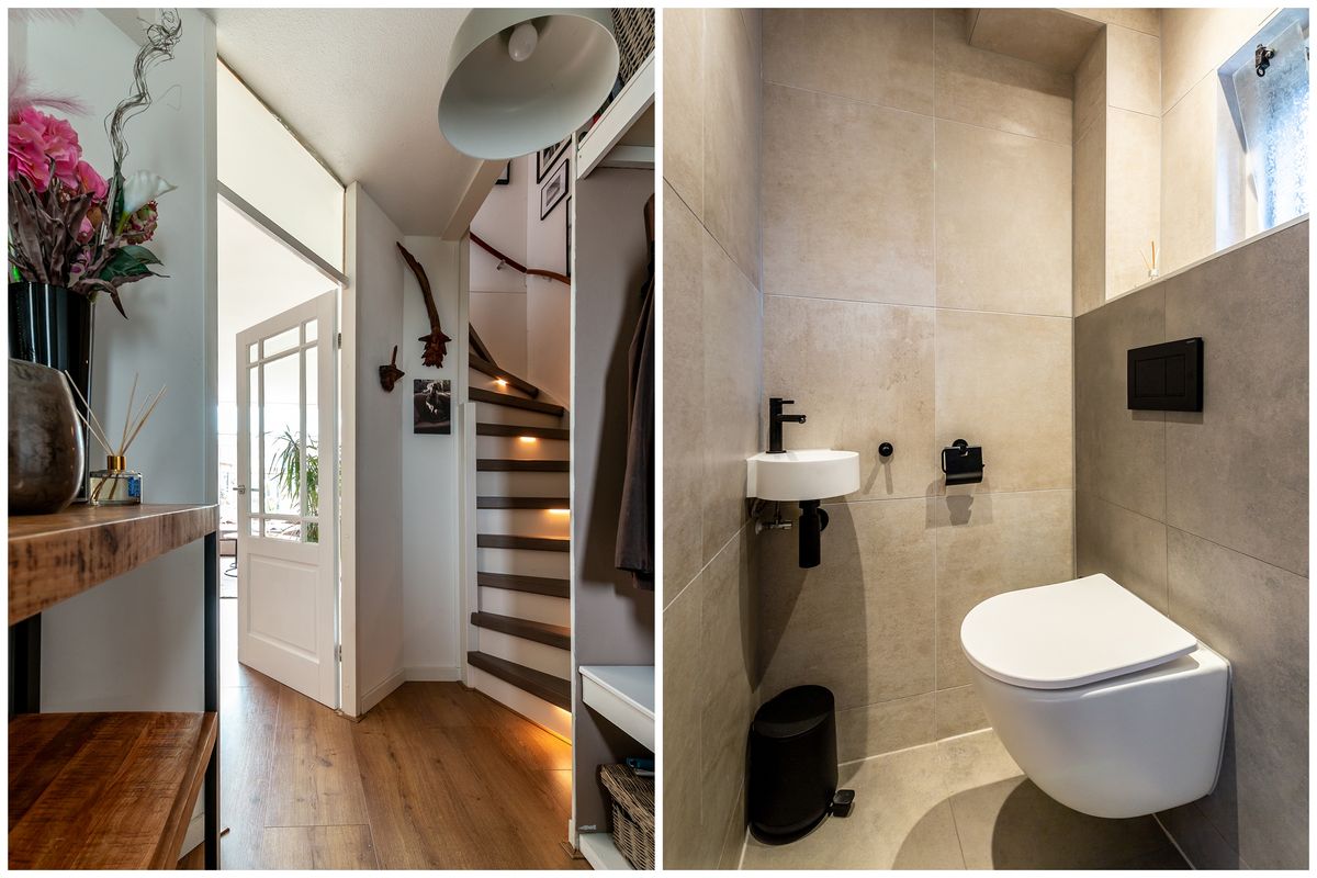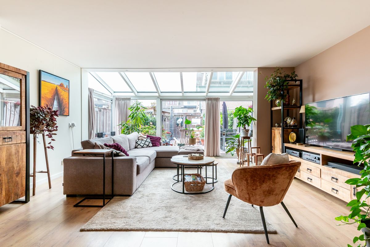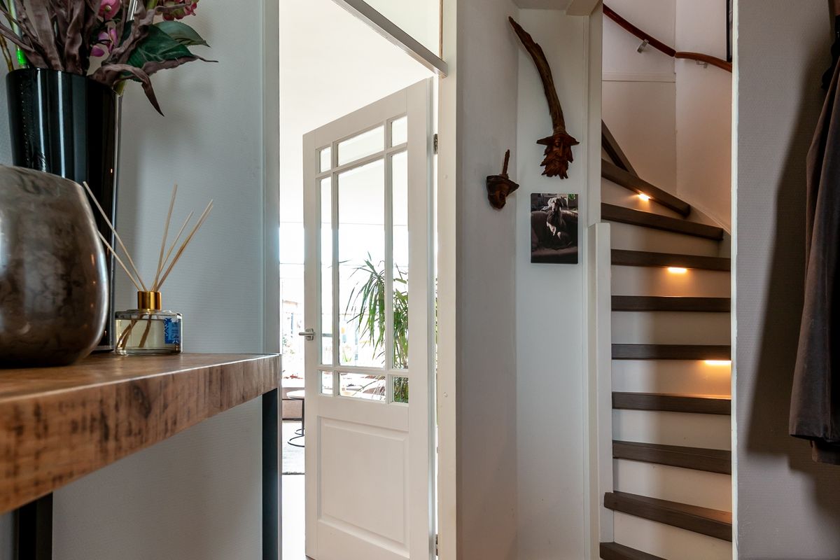 De hal, met de meterkast, het moderne zwevend toilet met fonteintje en de trap naar boven. Vanuit hier loop je door naar de woonkamer. Het eerste wat opvalt, is de hoeveelheid daglicht wat binnenvalt, de warme vloer en de nette afwerking. De woonkamer is door de serre met bijna 2 meter verlengd en door de aanwezigheid van het glazen dak brengt dit een heerlijk wooncomfort. Aan de voorzijde is de open keuken voorzien van diverse inbouwapparatuur (2021). Door de aanwezigheid van een airco voor koelen en verwarmen creëer je altijd het perfectie leefklimaat in huis. De grote schuifpui brengt binnen naar buiten en buiten naar binnen, een plek om je dag ontspannen te starten en op een heerlijke manier af te sluiten.