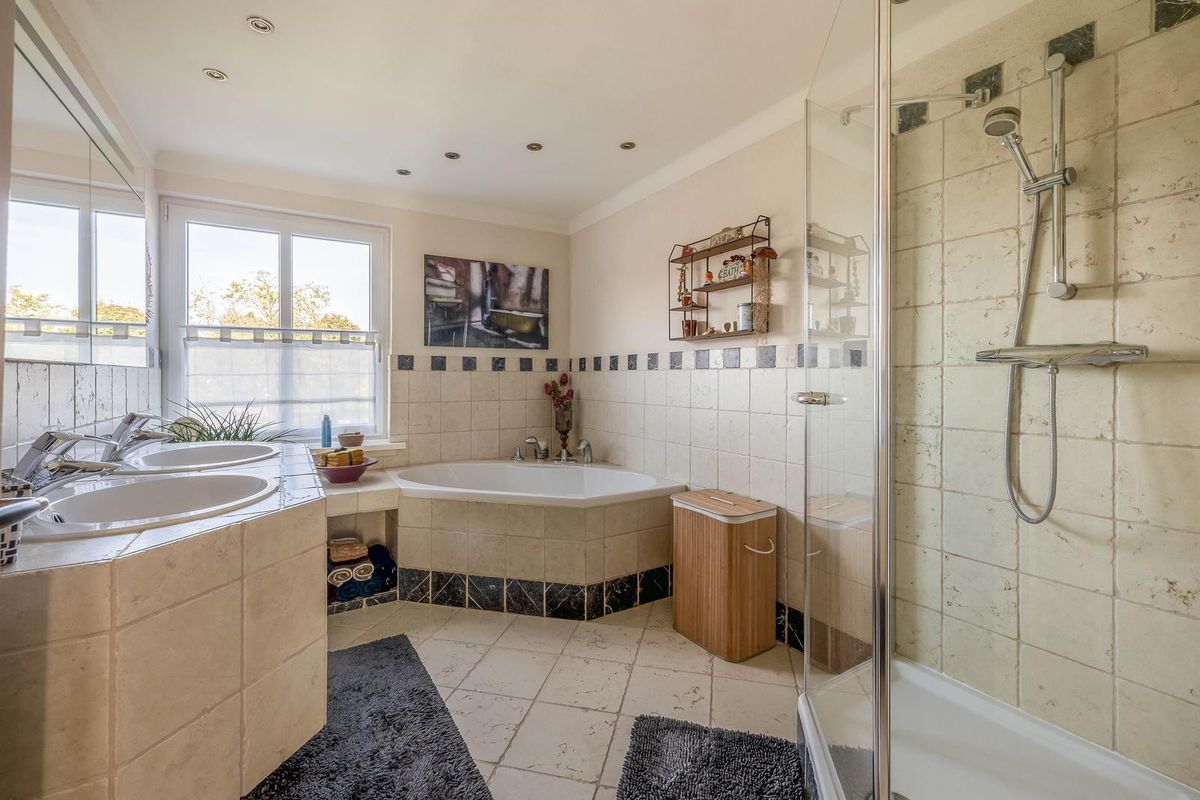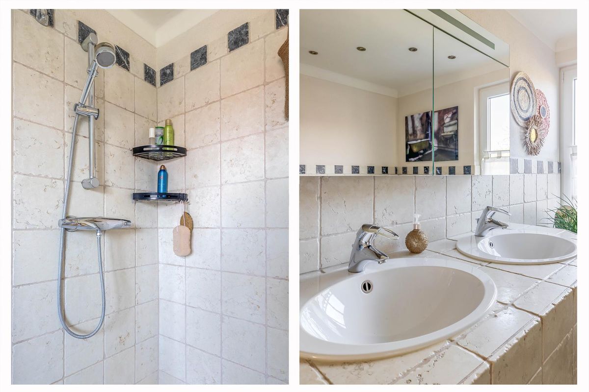 De badkamer is volledig uitgerust met een ligbad, inloopdouche, dubbel wastafel, designradiator én vloerverwarming – pure ontspanning!