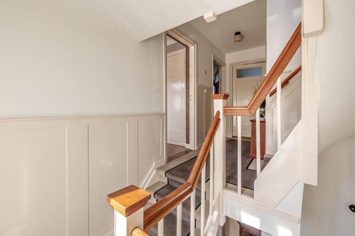De overloop met Frans balkon geeft toegang tot twee ruime slaapkamers, een apart toilet en de royale badkamer.