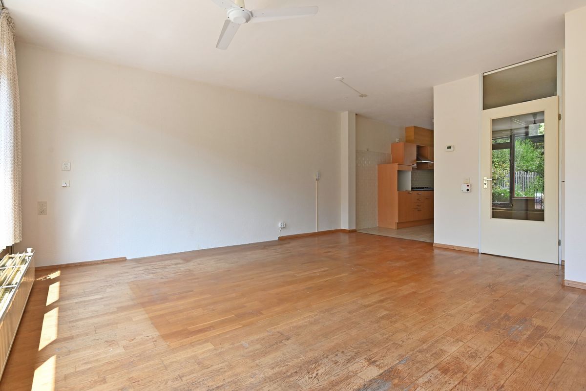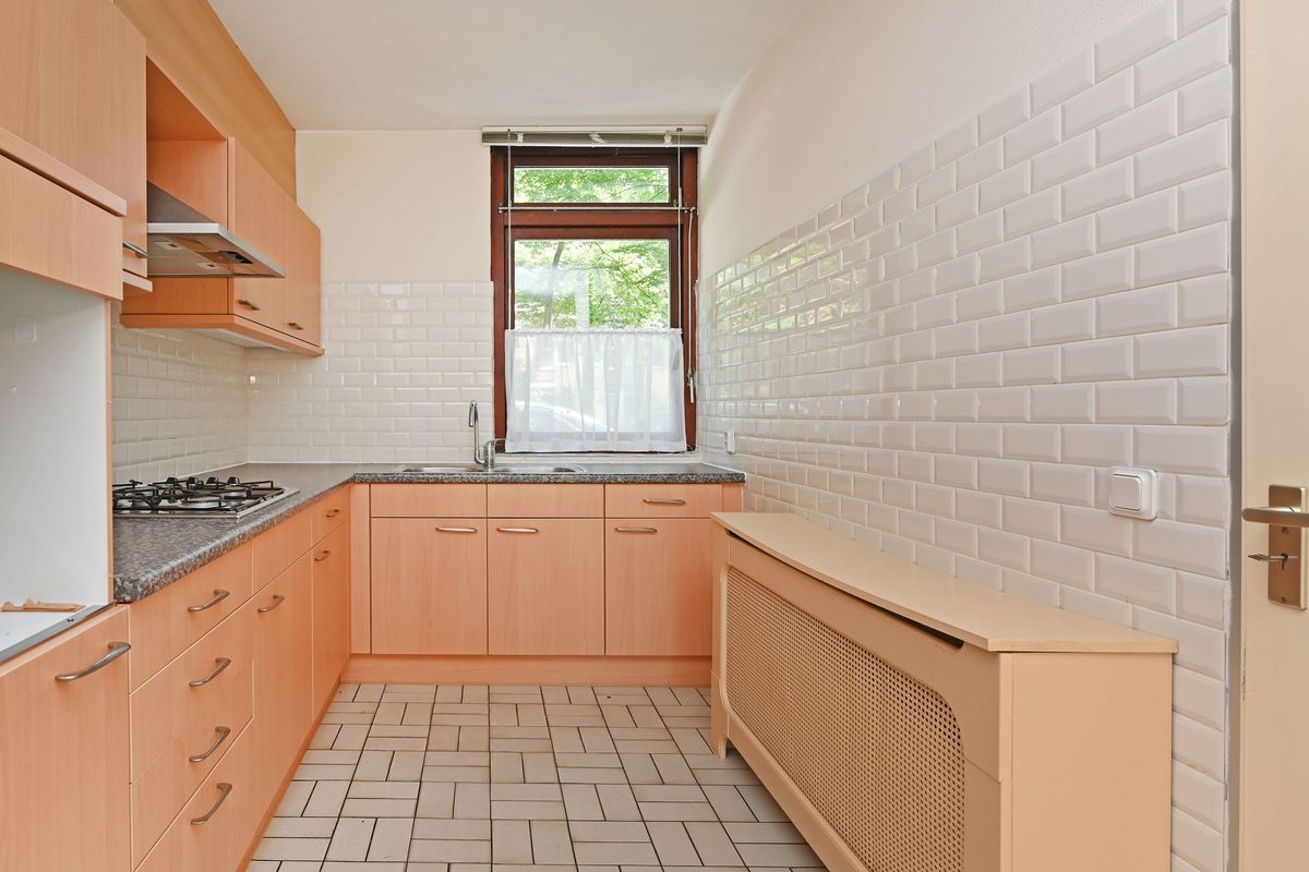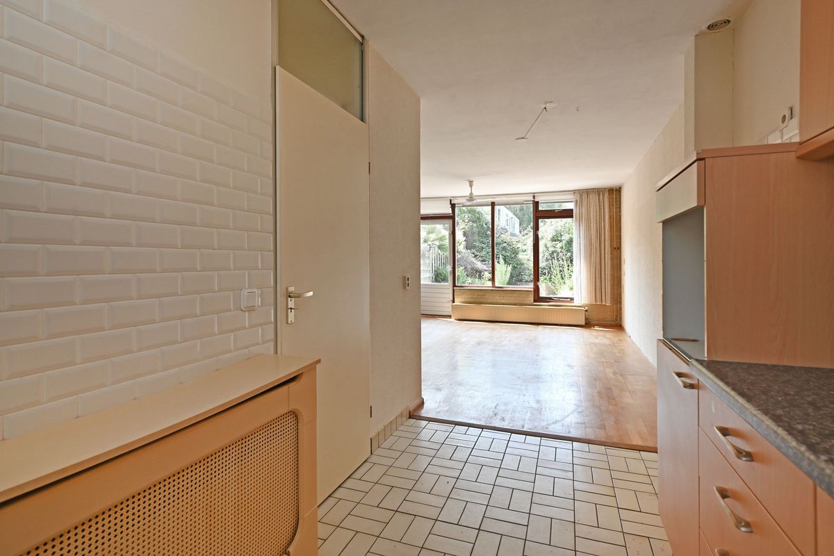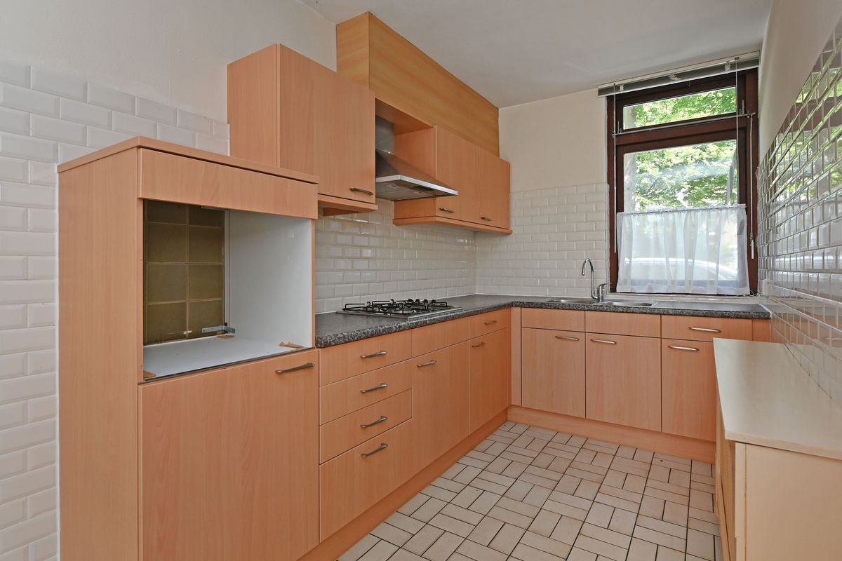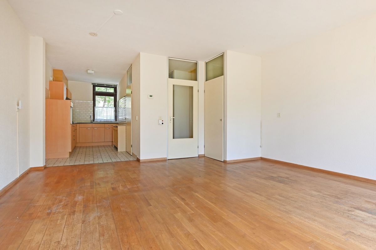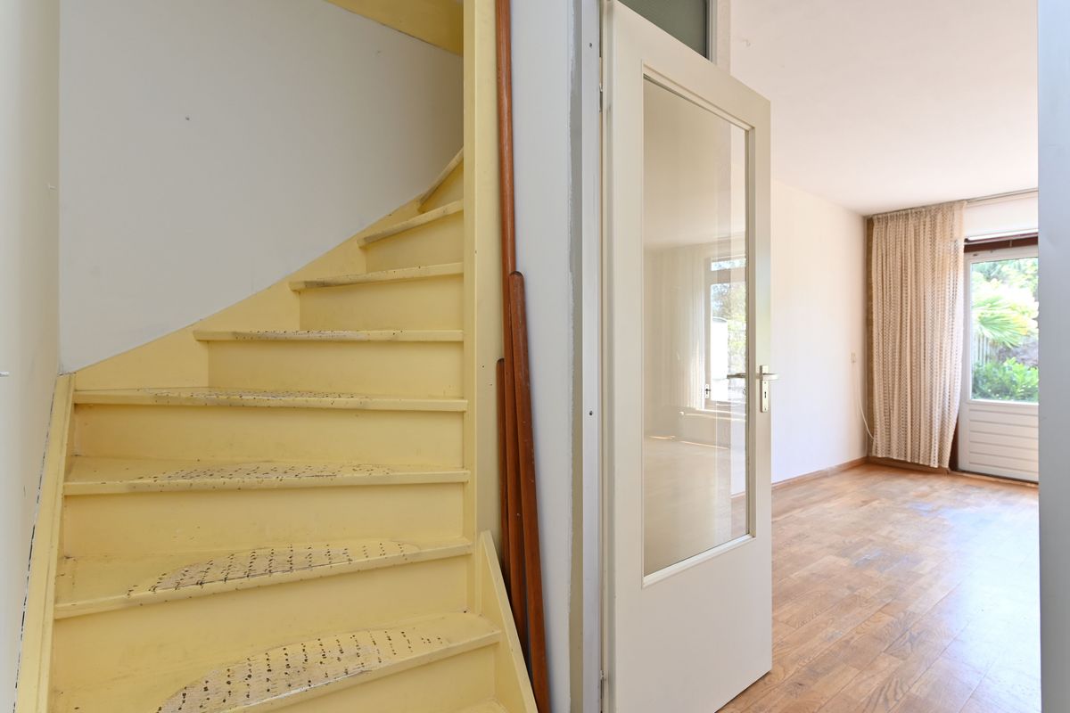 Begane grond: entree via de voortuin met toegang tot de fietsenberging. Hal met meterkast, trapopgang, ruimte voor separaat toilet en toegang tot de woonkamer. De L-vormige keuken ligt aan de voorzijde van de woning en is voorzien van veel kastruimte met een 4-pits gasfornuis, afzuigkap, gootsteen en boiler in het keukenkastje. De woonkamer heeft grote raampartijen en biedt een fijn uitzicht met directe toegang tot de zonnige achtertuin op het zuidwesten.