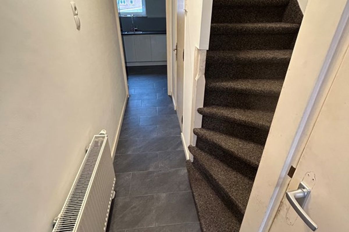 Entree/gang 4,10 x 0,85 met plavuizenvloer, nieuwe meterkast, deur naar keuken, kelder en gastentoilet en trap naar verdieping.