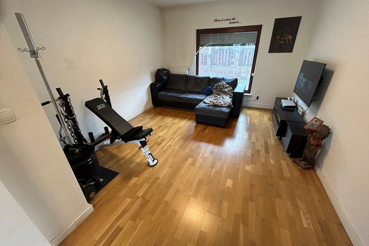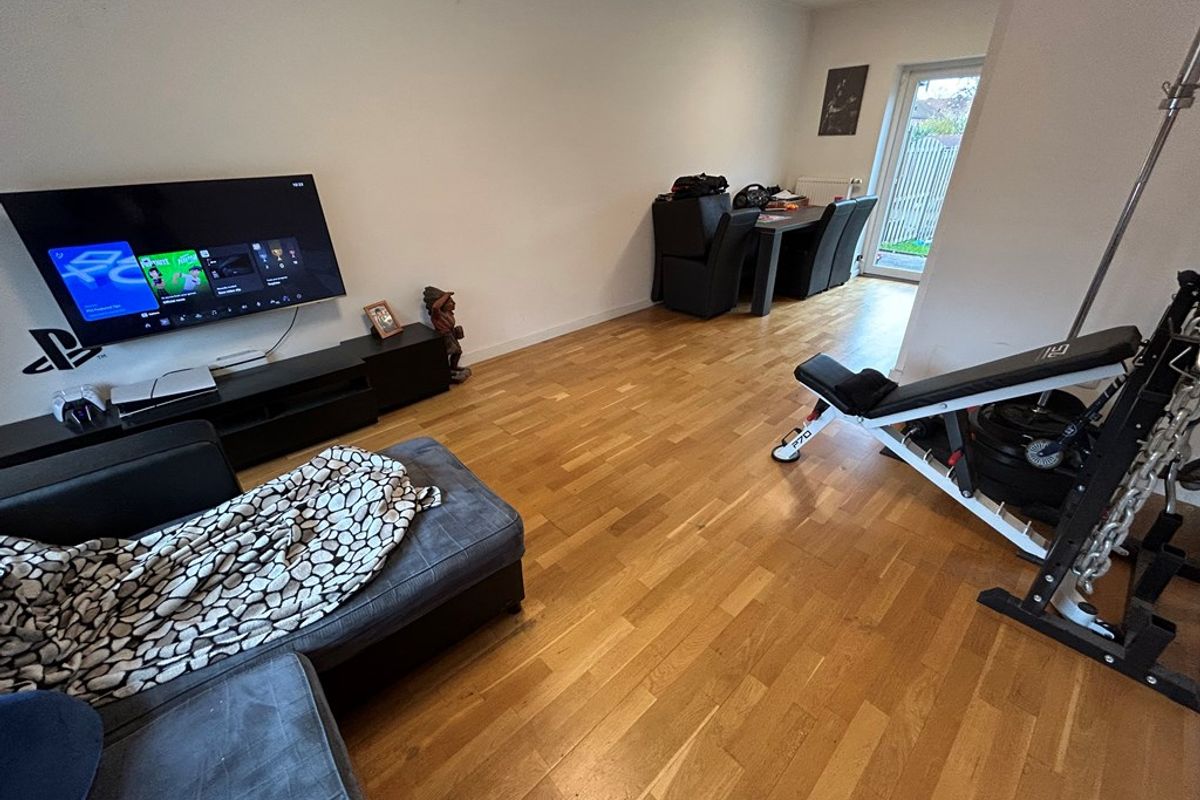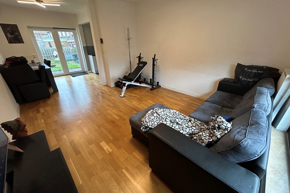 L-vormige woonkamer 6,90 x 3,65/2,50 met parketvloer, openslaande deuren naar achtertuin en open keuken.