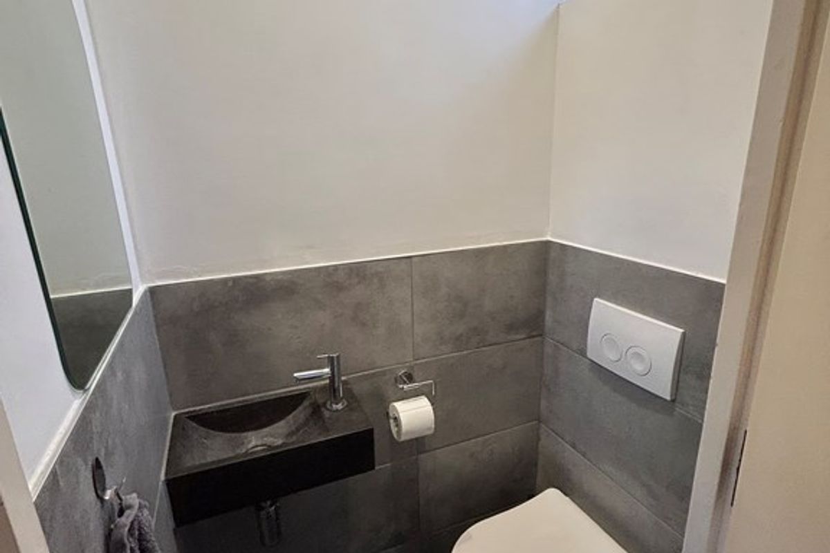 Gastentoilet 1,05 x 0,70 met plavuizenvloer, inbouwspot, hangtoilet en fonteintje.