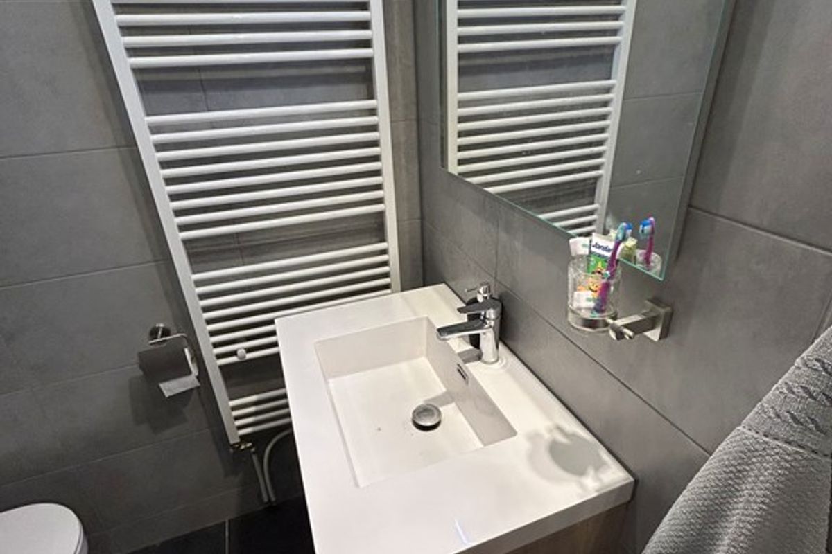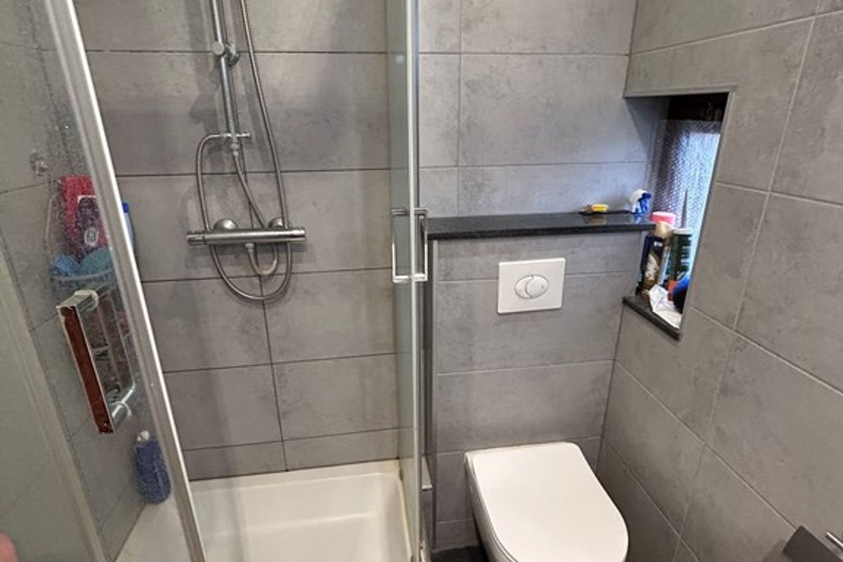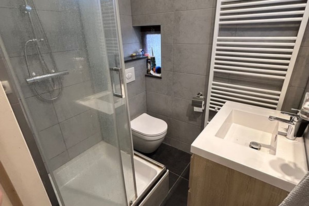 Badkamer 1,70 x 1,55 met plavuizenvloer, inbouwspots, douche met cabine, hangtoilet, badkamermeubel met wastafel en design radiator.