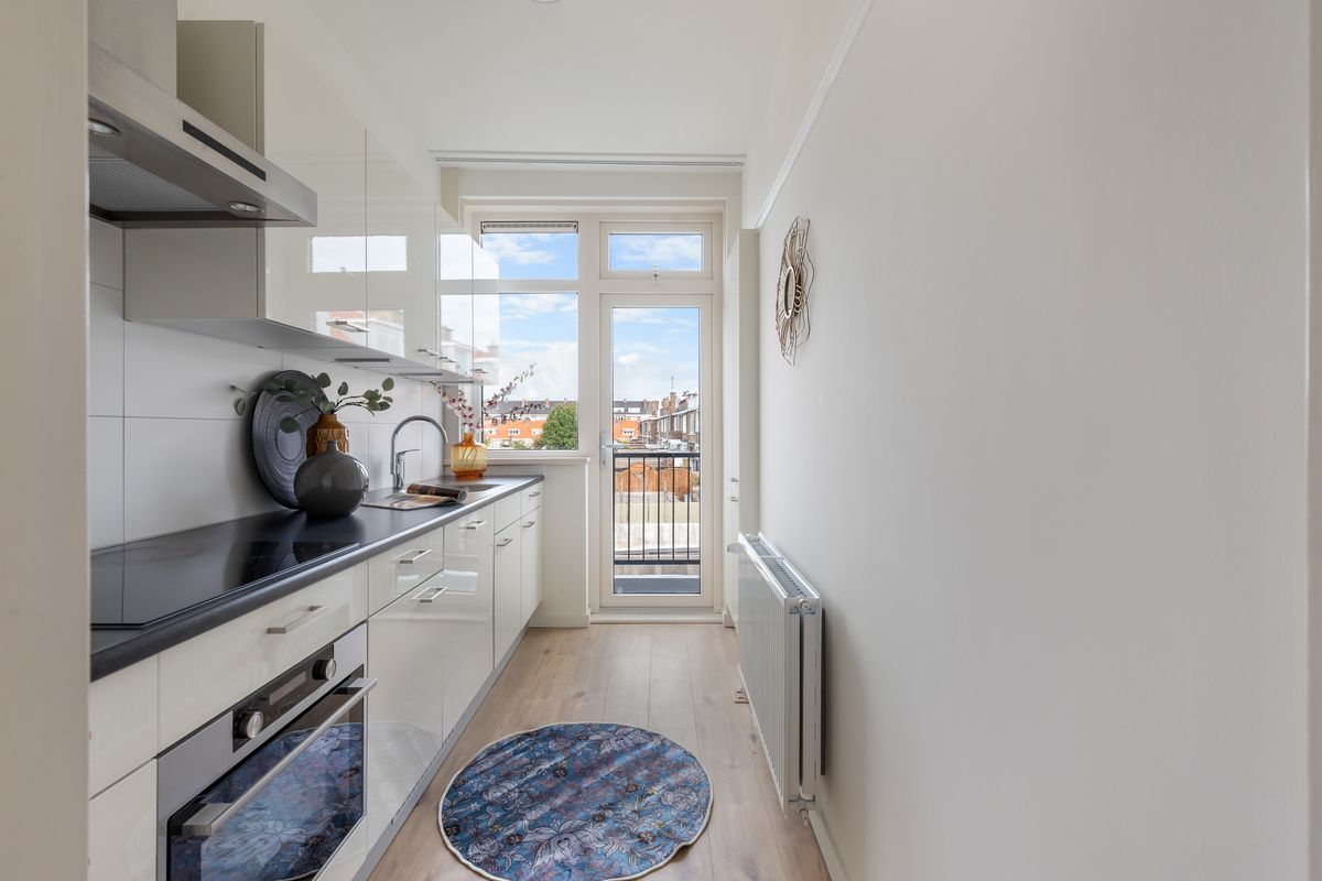De keuken met inbouwapparatuur, beschikt ook over een deur naar het balkon, die gelegen is op het noordwesten en middag/avond zon biedt. Ideaal voor een borrel of een diner in de zon!