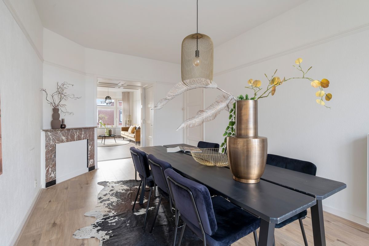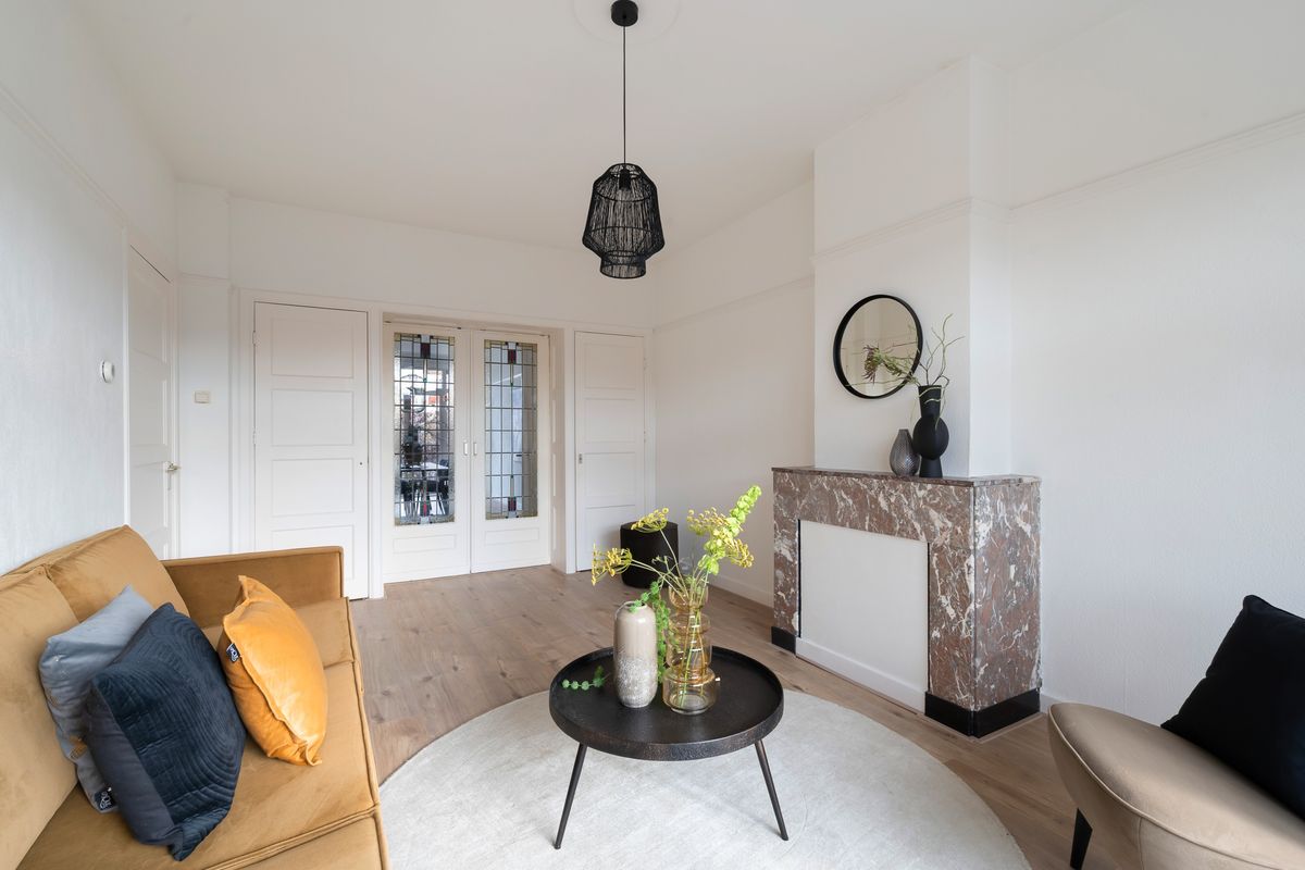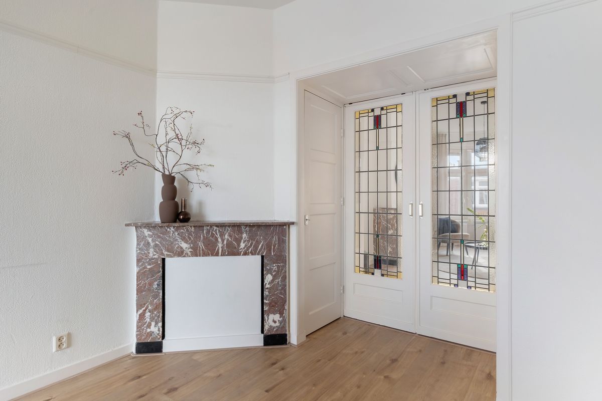 Via het open portiek bereik je de entree van het appartement en neem je de trap naar de tweede etage. De ruime overloop biedt toegang tot alle vertrekken. De sfeervolle en royale woon-/eetkamer is een echte eyecatcher, nog voorzien van de originele en-suite separatie met schuifdeuren, ingebouwde kasten, authentieke schouwen en openslaande deuren naar het brede, zonnige balkon. (avondzon)