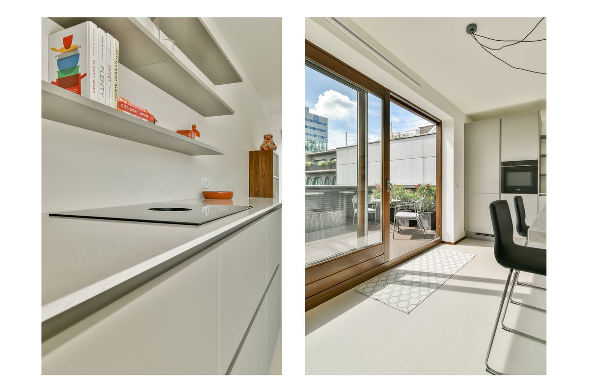 De moderne keuken is uitgerust met o.a. een Bora inductiekookplaat, koel-vriescombinatie, vaatwasser en combi-oven/magnetron. Het grote kookeiland nodigt uit tot gezellig samenzijn, terwijl de zon door de schuifdeuren naar binnen valt.
