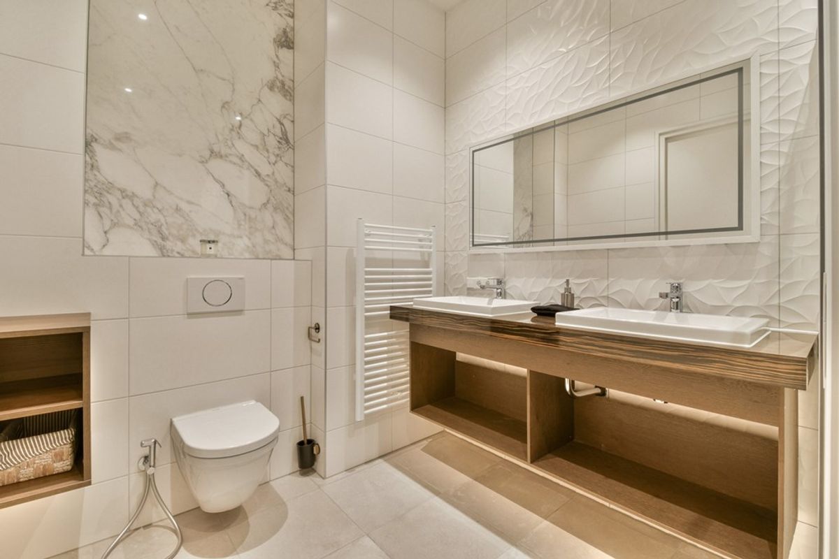 Bathroom featuring a wall-hung toilet, double designer washbasin, and walk-in shower