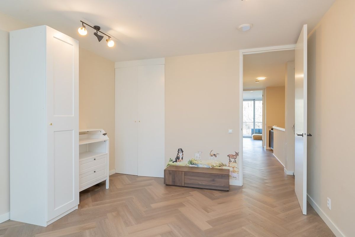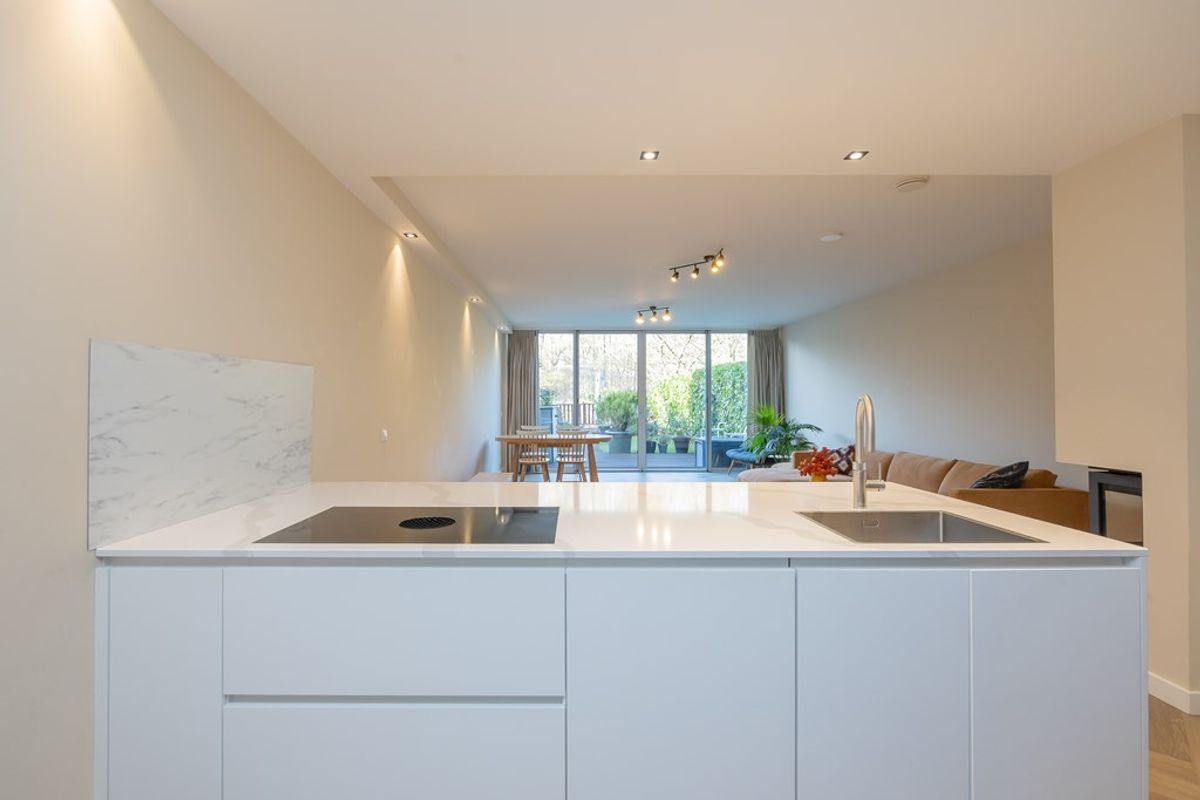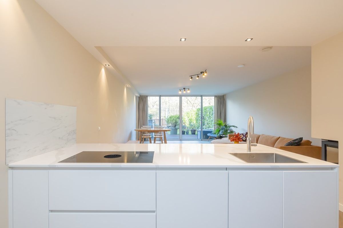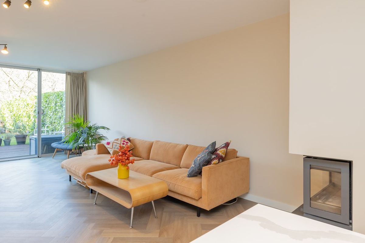 The home was built in 2005, completely renovated in 2022 and has an energy label A+. The modern open kitchen (2022) with cooking island is fully equipped with high-quality appliances. The bright living room features a high-efficiency wood-burning fireplace and sliding doors opening onto the exceptionally deep garden with multiple terraces. On this floor there is a room that can be used as a bedroom and/or a home office.
