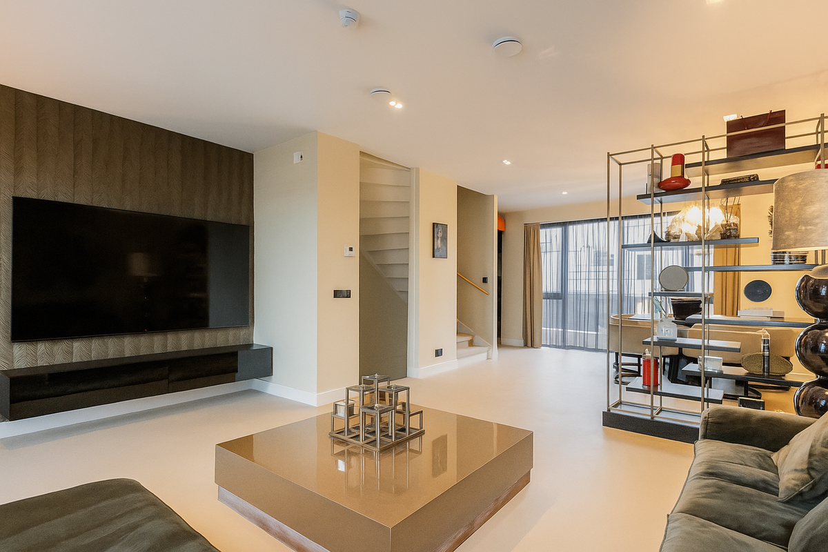 De gehele woning is v.v. strak gestucte plafonds met inbouwspots en strakke wanden;